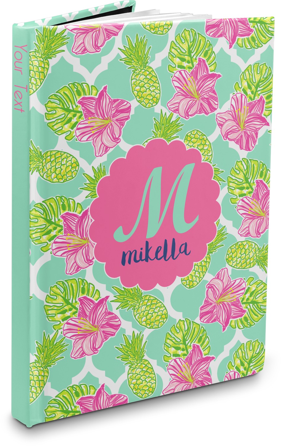 The background is a mint and white Moroccan lattice with brightly colored hibiscus flowers and pineapples. A scalloped frame sits in the center of the design with a fun name and initial personalization. With all of the fun bright yellows, greens, and pinks, you will just fawn over this design.
