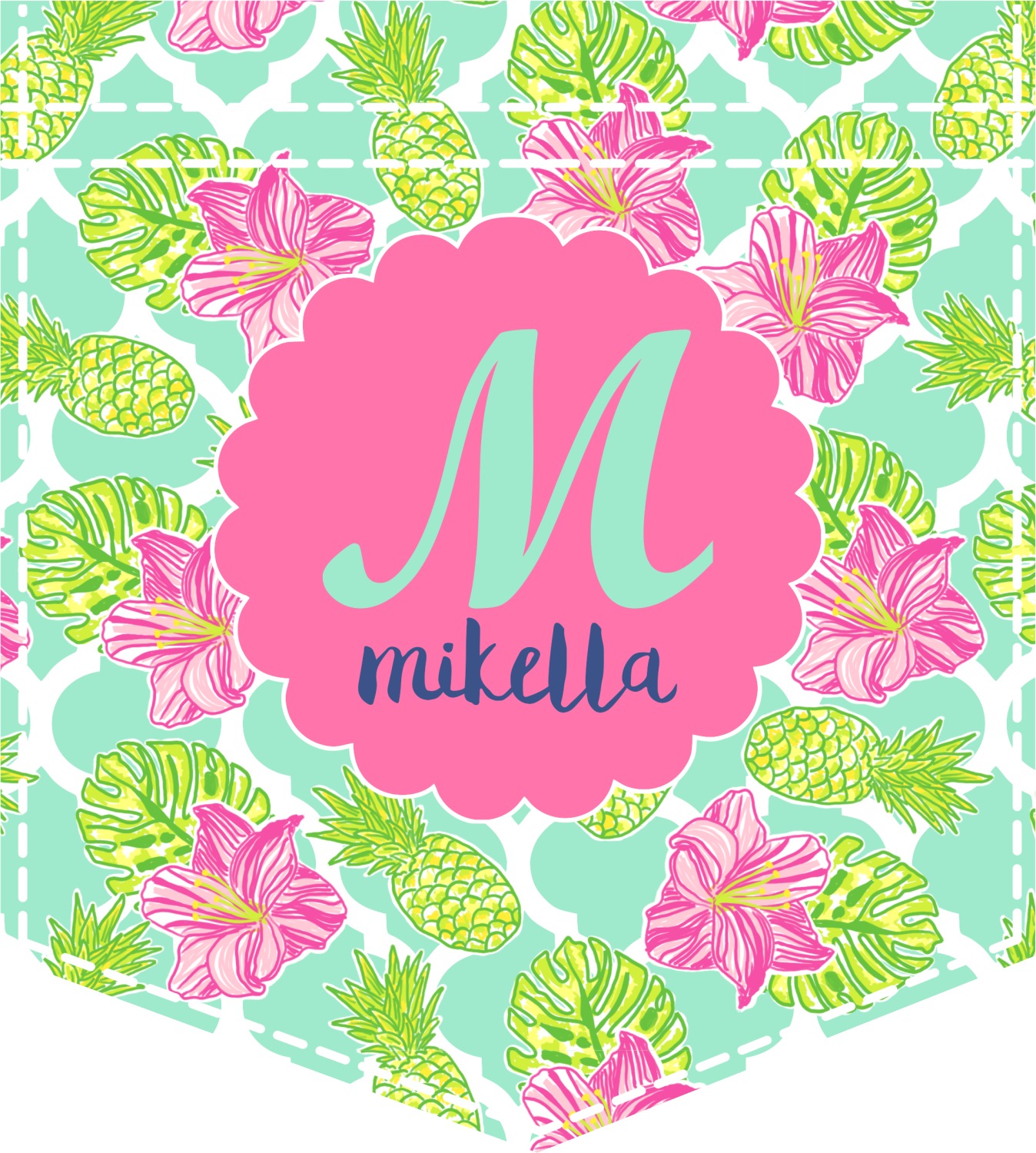 The background is a mint and white Moroccan lattice with brightly colored hibiscus flowers and pineapples. A scalloped frame sits in the center of the design with a fun name and initial personalization. With all of the fun bright yellows, greens, and pinks, you will just fawn over this design.