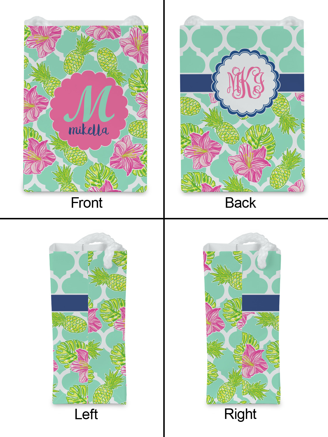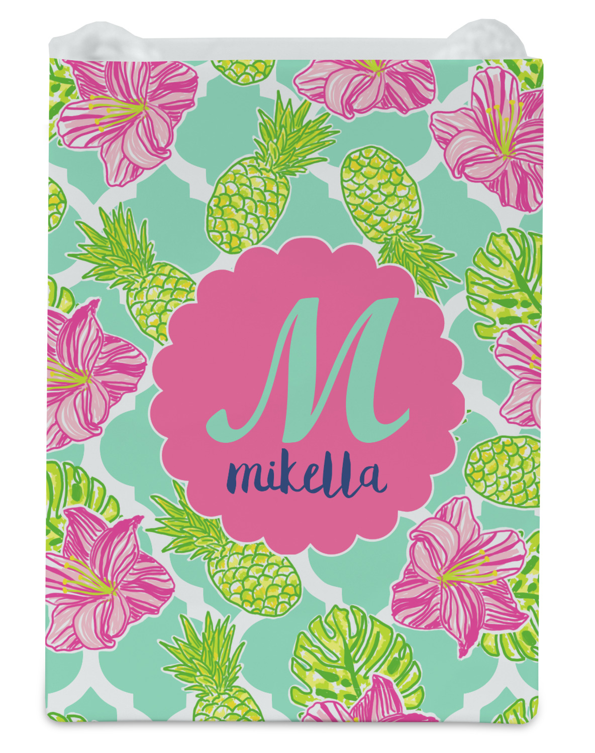 The background is a mint and white Moroccan lattice with brightly colored hibiscus flowers and pineapples. A scalloped frame sits in the center of the design with a fun name and initial personalization. With all of the fun bright yellows, greens, and pinks, you will just fawn over this design.