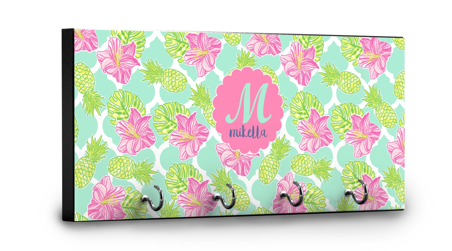 The background is a mint and white Moroccan lattice with brightly colored hibiscus flowers and pineapples. A scalloped frame sits in the center of the design with a fun name and initial personalization. With all of the fun bright yellows, greens, and pinks, you will just fawn over this design.
