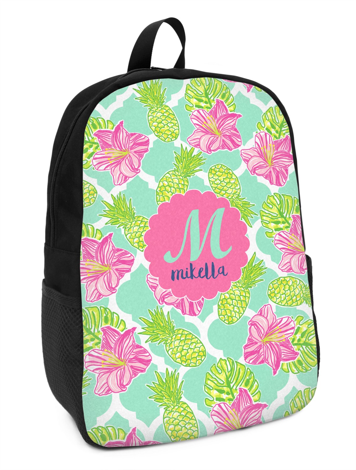 The background is a mint and white Moroccan lattice with brightly colored hibiscus flowers and pineapples. A scalloped frame sits in the center of the design with a fun name and initial personalization. With all of the fun bright yellows, greens, and pinks, you will just fawn over this design.