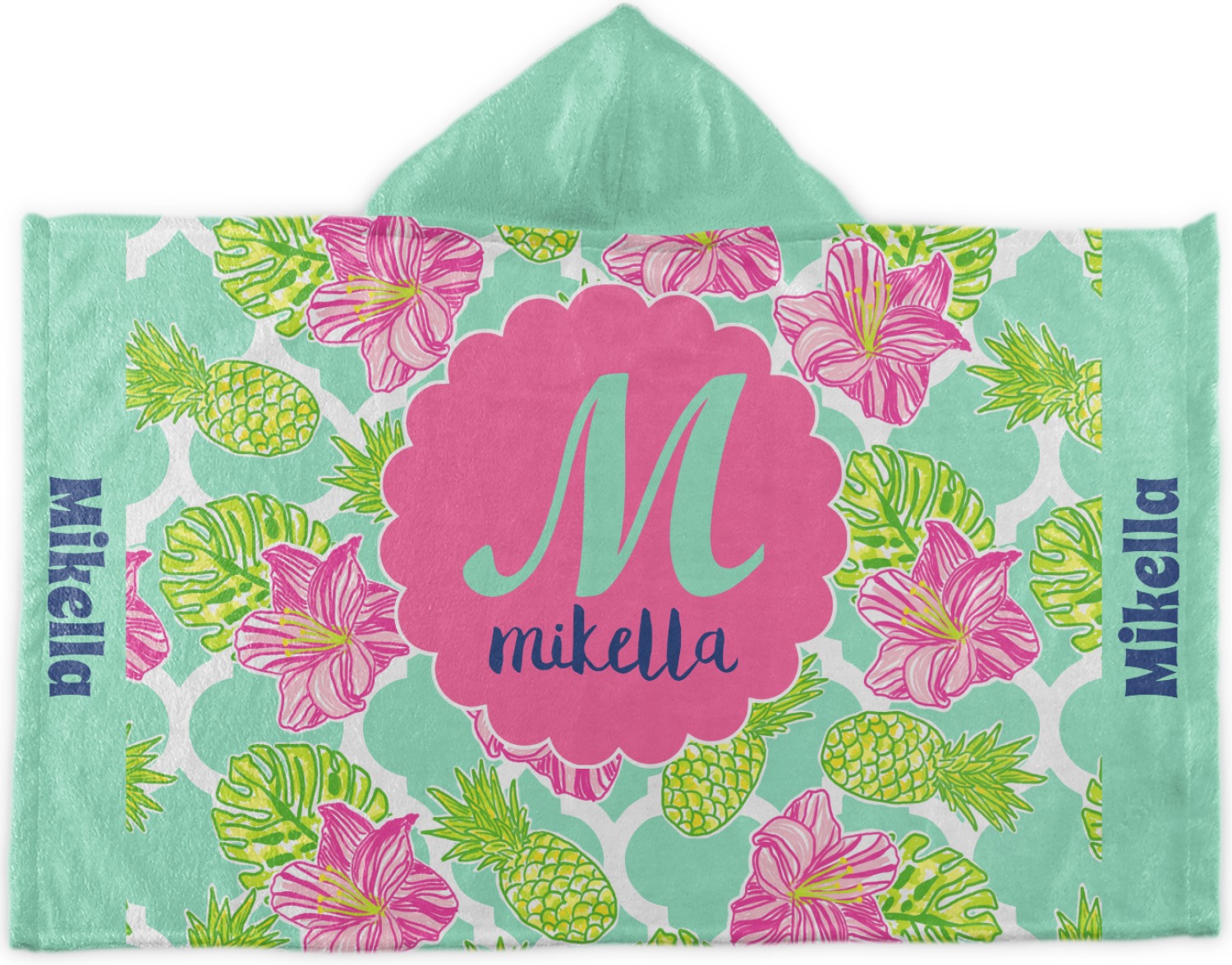 The background is a mint and white Moroccan lattice with brightly colored hibiscus flowers and pineapples. A scalloped frame sits in the center of the design with a fun name and initial personalization. With all of the fun bright yellows, greens, and pinks, you will just fawn over this design.