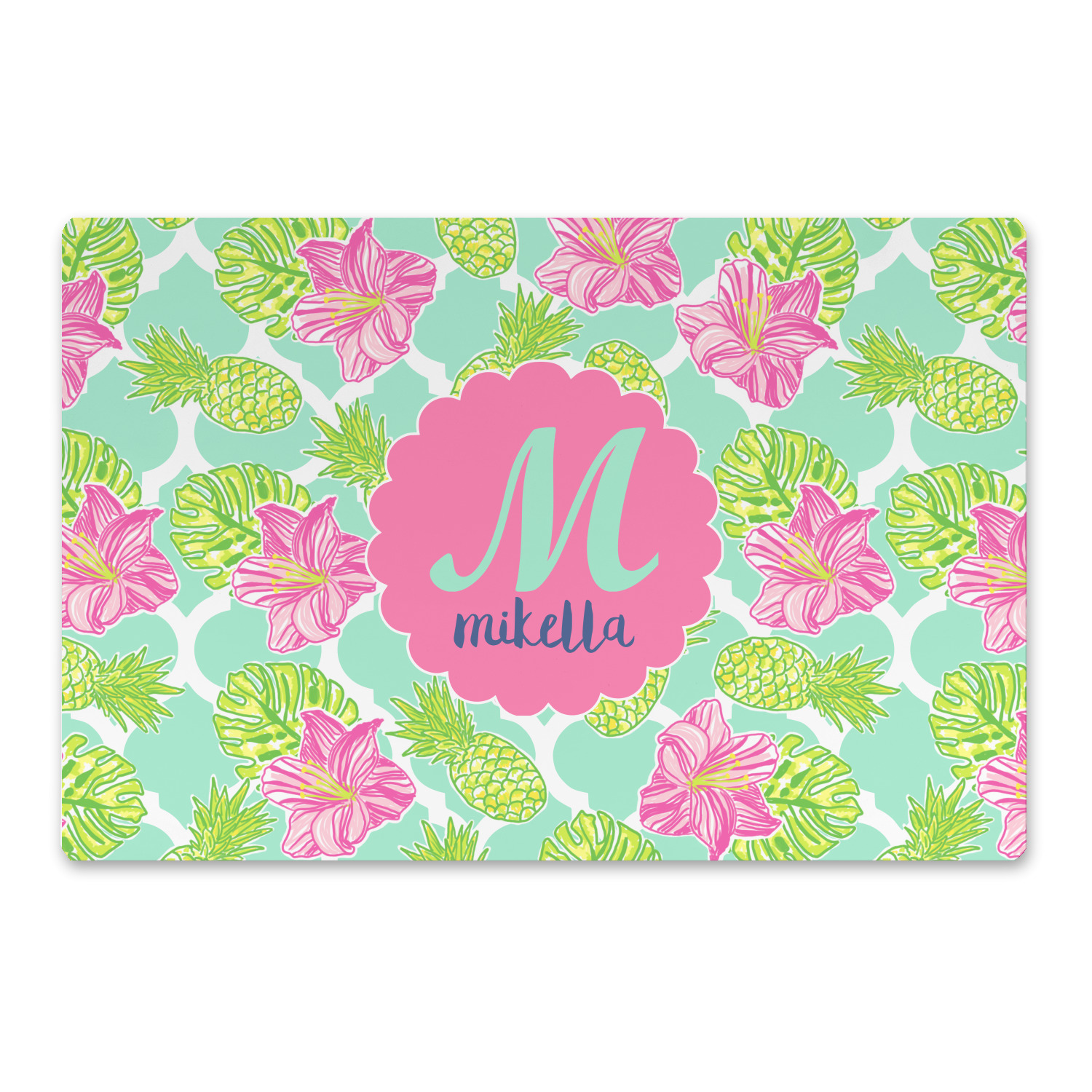 The background is a mint and white Moroccan lattice with brightly colored hibiscus flowers and pineapples. A scalloped frame sits in the center of the design with a fun name and initial personalization. With all of the fun bright yellows, greens, and pinks, you will just fawn over this design.