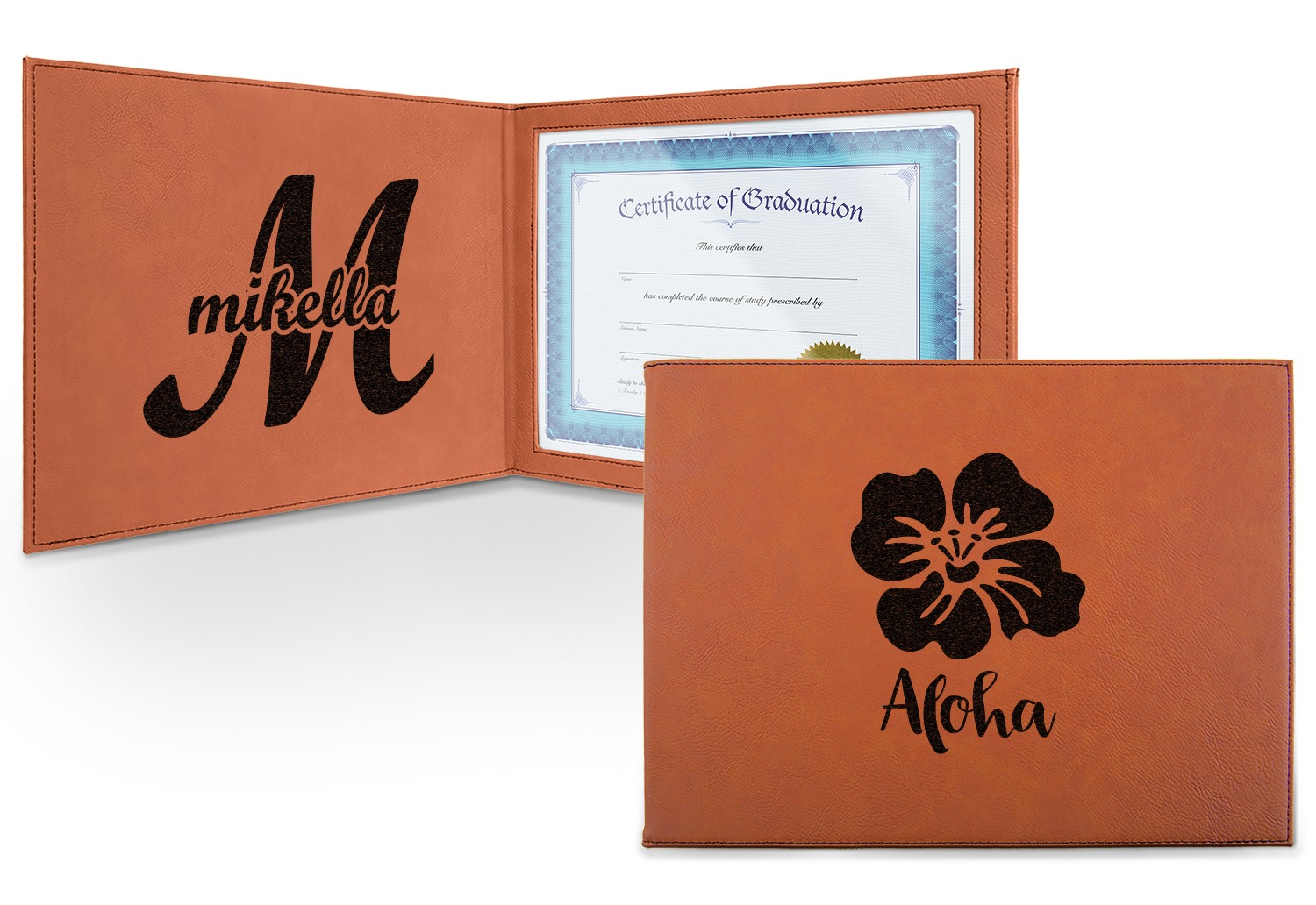 This cognac-colored, leatherette certificate jacket is the ideal way to display or store your hard-earned certificate. When closed, the custom certificate holder measures at 12 by 9 inches. The interior of the certificate cover includes a clear, vinyl window to encase your diploma. The window measures at around 10.5 by 7.5 inches and can accommodate a diploma that measures at up to 8.5 by 11 inches. You can either choose to have your customization laser engraved on the front and interior, or solely the front.