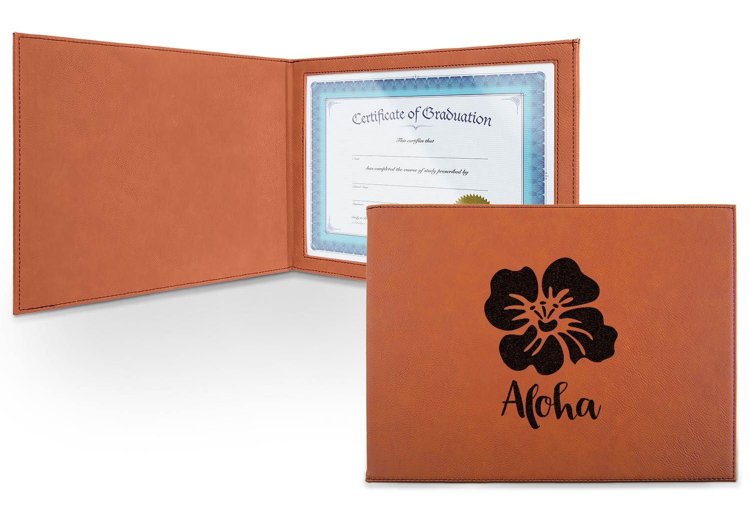 This cognac-colored, leatherette certificate jacket is the ideal way to display or store your hard-earned certificate. When closed, the custom certificate holder measures at 12 by 9 inches. The interior of the certificate cover includes a clear, vinyl window to encase your diploma. The window measures at around 10.5 by 7.5 inches and can accommodate a diploma that measures at up to 8.5 by 11 inches. You can either choose to have your customization laser engraved on the front and interior, or solely the front.