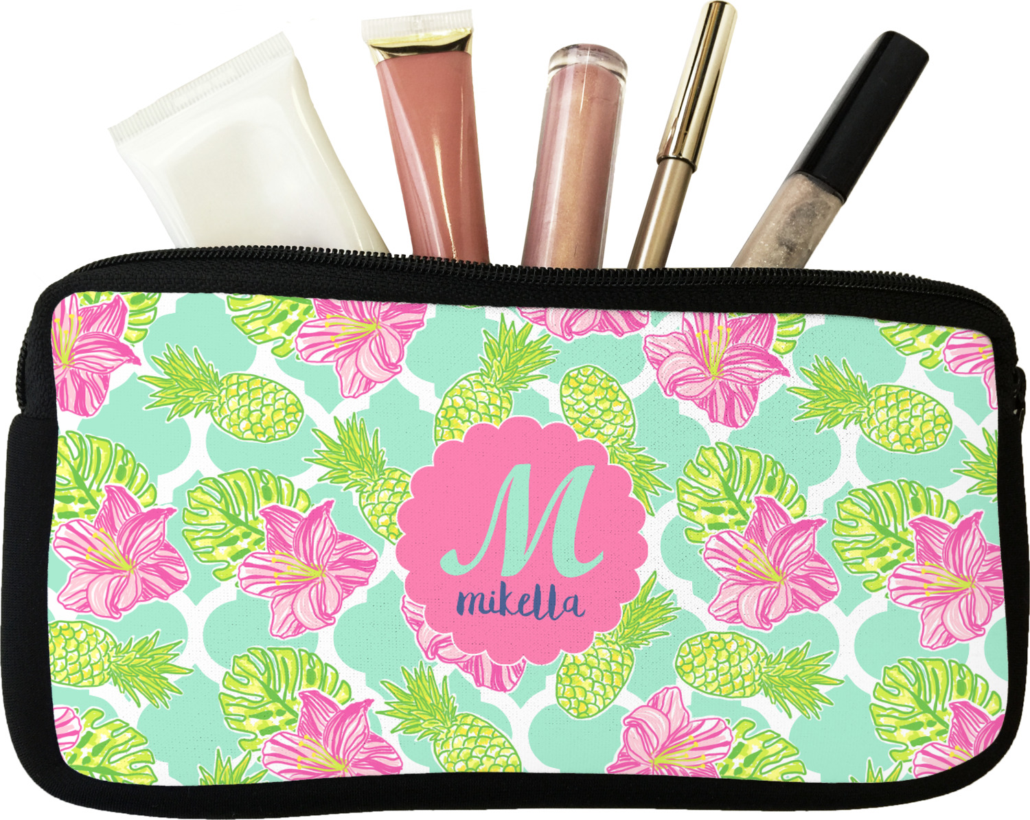 Our personalized makeup bags are available in many different designs, patterns and colors - so you are sure to find one that will love. They are made of neoprene (same material as wet-suits) and thus are water resistant, so spillages in your makeup bag will not end up all over you purse. They are customized on one side and are black on the other side and the zipper is black as well.