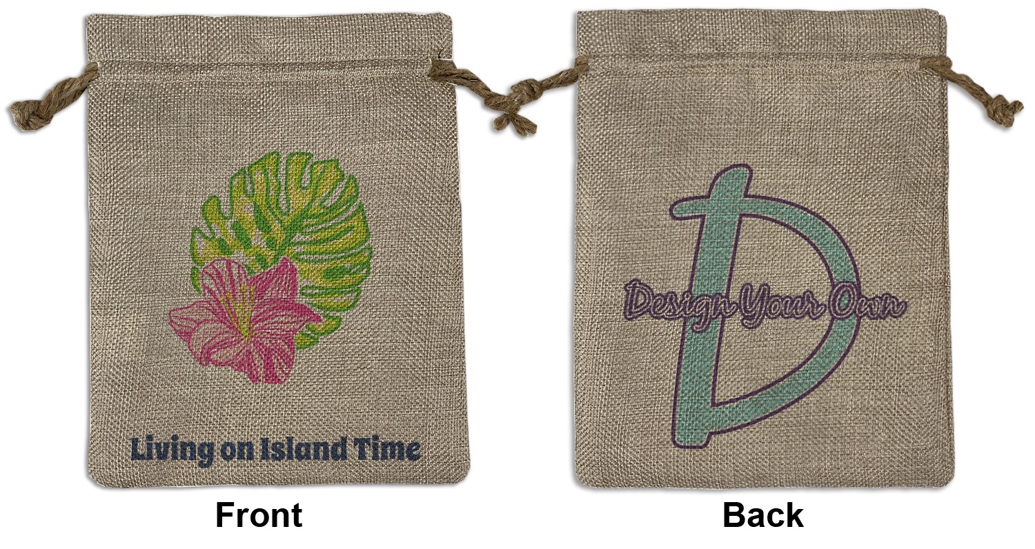 We sell our Burlap Gift Bags in 3 variant sized bags. Made with burlap polyester, each personalized bag can be secured with a twine drawstring pull. Your custom design is available to print on one side or both sides - completely up to you! The sizes of the bags measure approximately 4.5" x 6.5" for the smallest size, 6.5" x 8.0" for the medium size, and 6.5" x 13.5" for the large-sized bag.