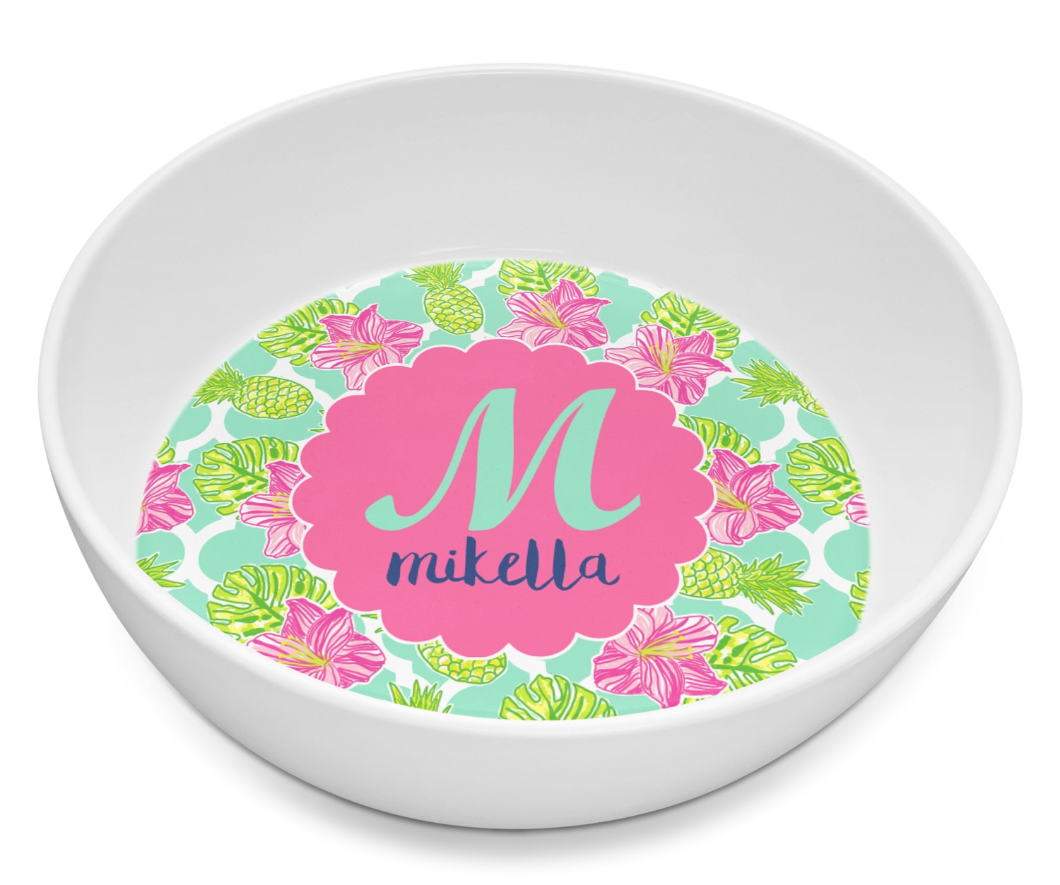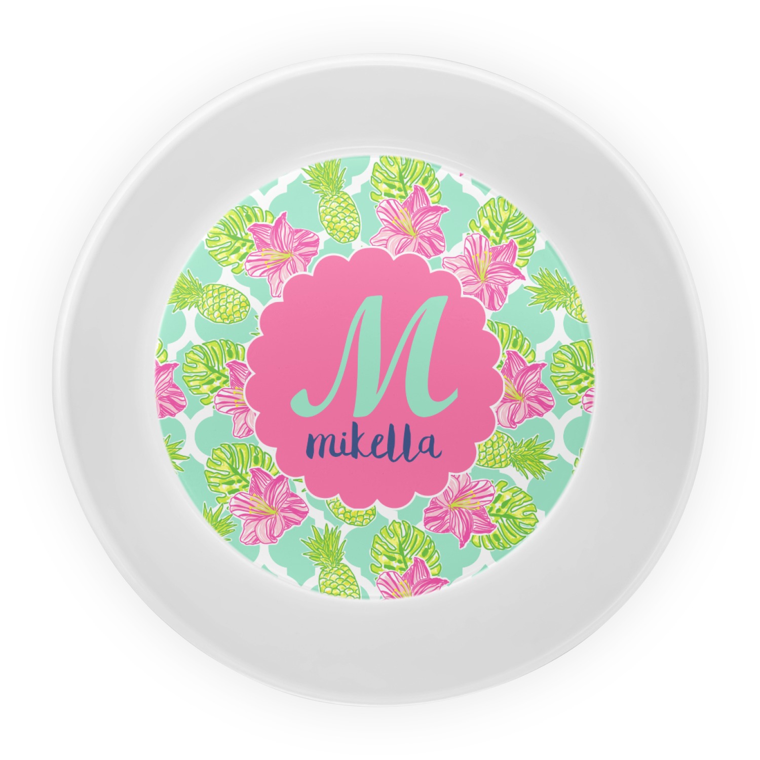 The background is a mint and white Moroccan lattice with brightly colored hibiscus flowers and pineapples. A scalloped frame sits in the center of the design with a fun name and initial personalization. With all of the fun bright yellows, greens, and pinks, you will just fawn over this design.