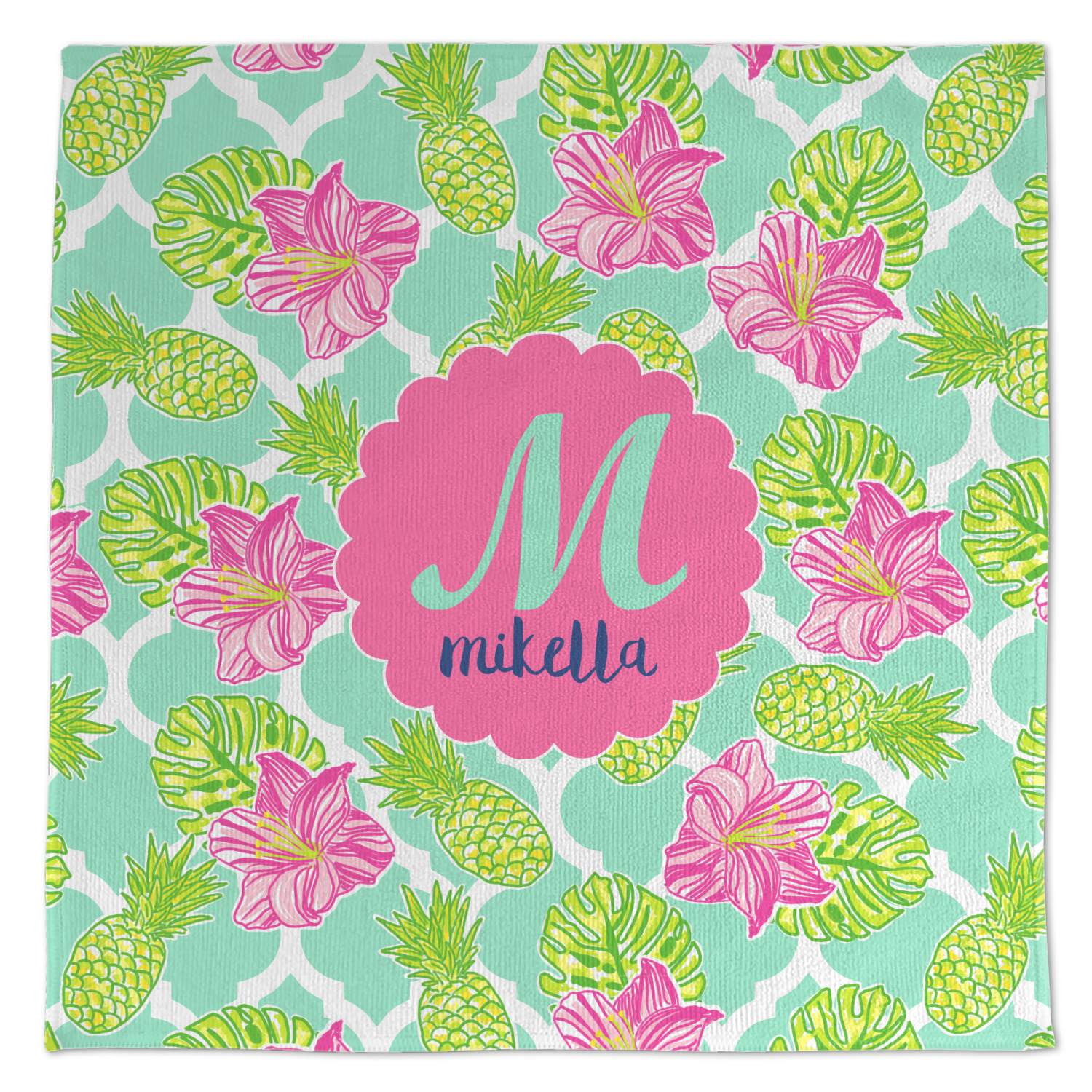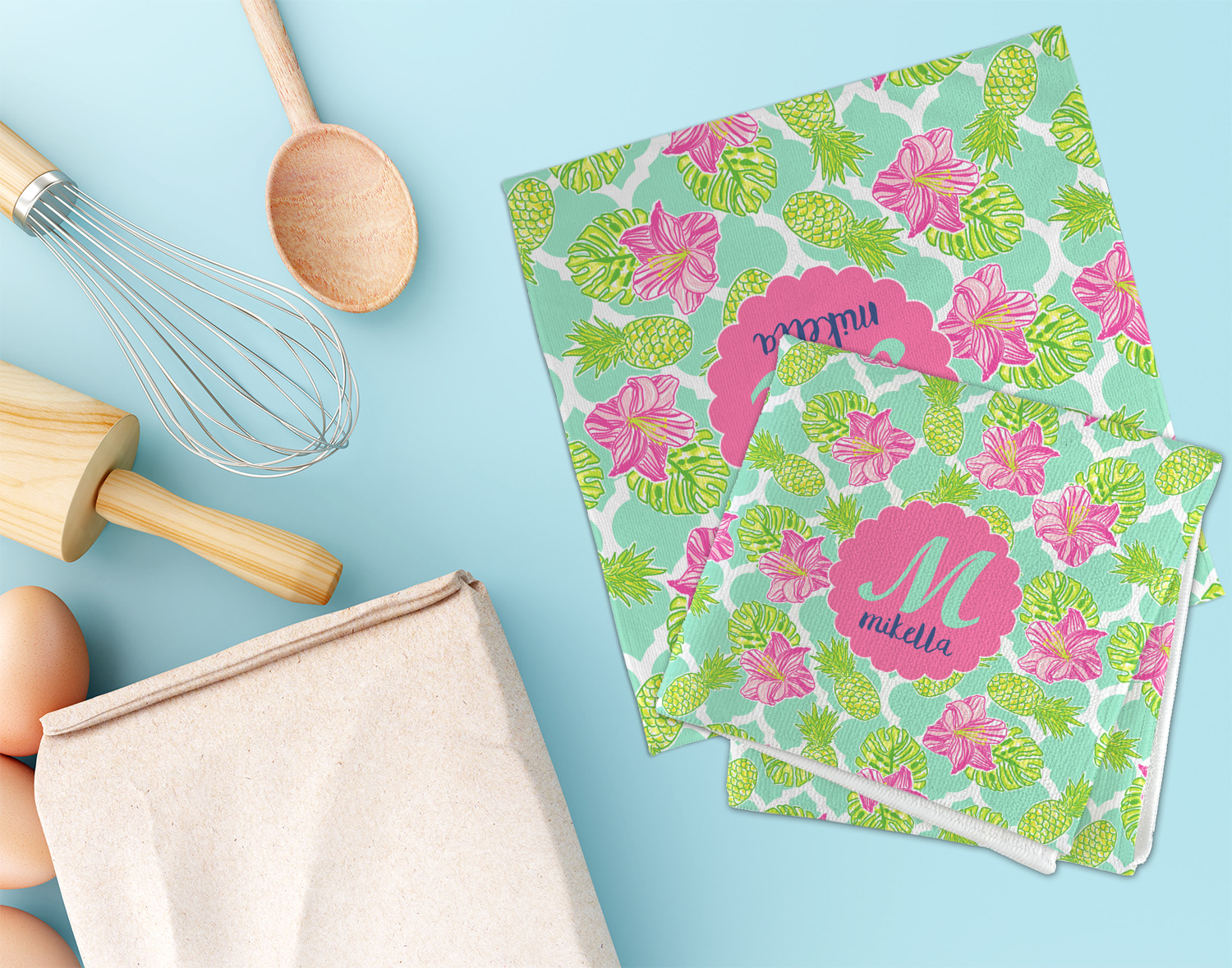 The background is a mint and white Moroccan lattice with brightly colored hibiscus flowers and pineapples. A scalloped frame sits in the center of the design with a fun name and initial personalization. With all of the fun bright yellows, greens, and pinks, you will just fawn over this design.