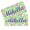 The background is a mint and white Moroccan lattice with brightly colored hibiscus flowers and pineapples. A scalloped frame sits in the center of the design with a fun name and initial personalization. With all of the fun bright yellows, greens, and pinks, you will just fawn over this design.