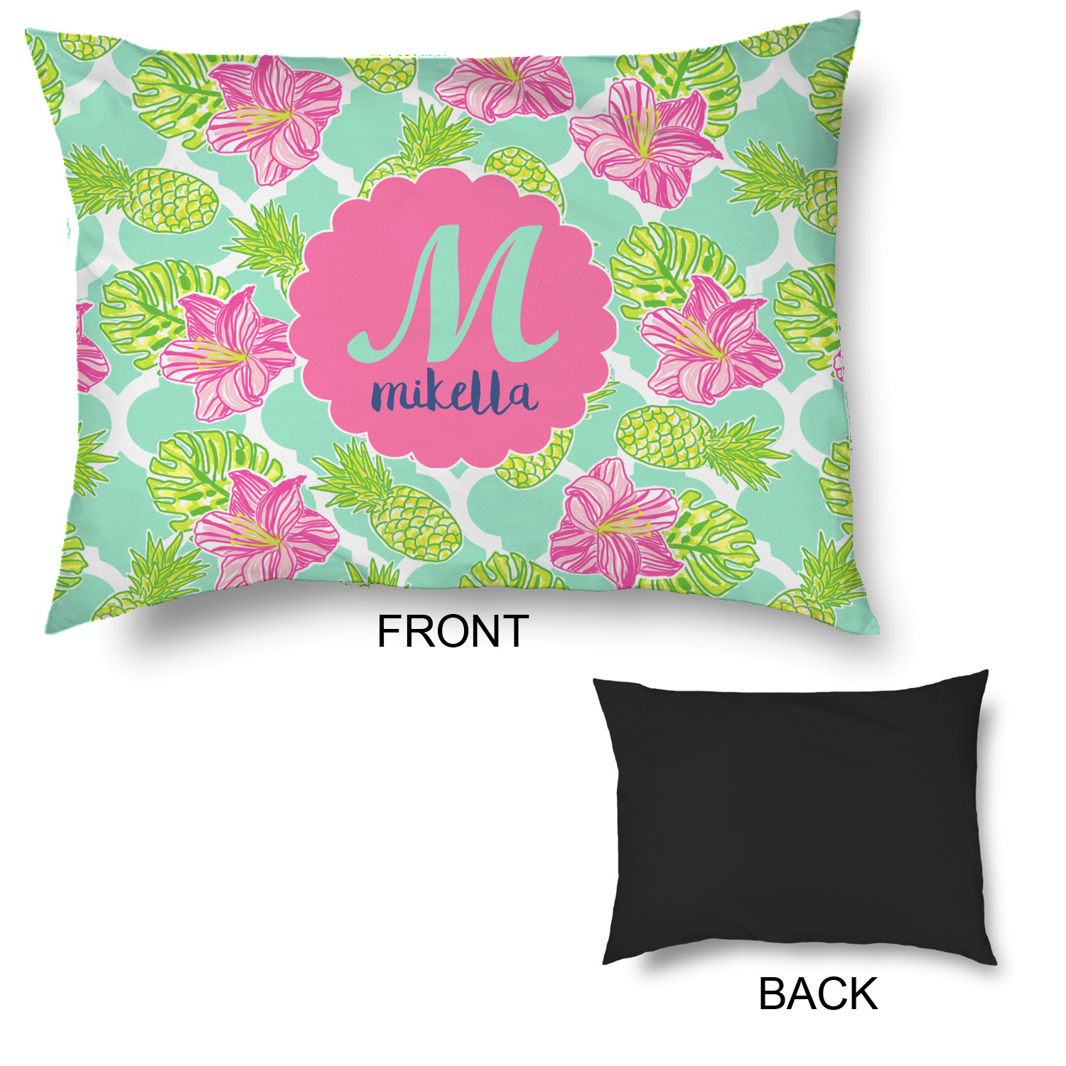 The background is a mint and white Moroccan lattice with brightly colored hibiscus flowers and pineapples. A scalloped frame sits in the center of the design with a fun name and initial personalization. With all of the fun bright yellows, greens, and pinks, you will just fawn over this design.