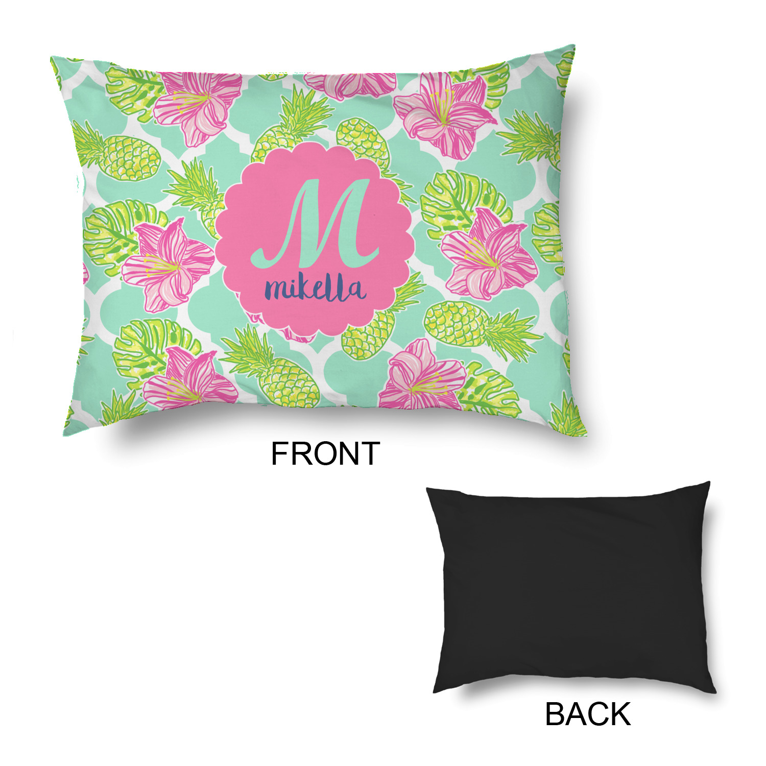 The background is a mint and white Moroccan lattice with brightly colored hibiscus flowers and pineapples. A scalloped frame sits in the center of the design with a fun name and initial personalization. With all of the fun bright yellows, greens, and pinks, you will just fawn over this design.