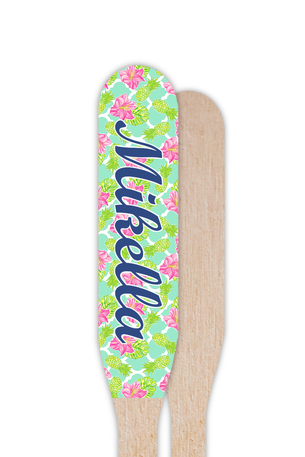 The background is a mint and white Moroccan lattice with brightly colored hibiscus flowers and pineapples. A scalloped frame sits in the center of the design with a fun name and initial personalization. With all of the fun bright yellows, greens, and pinks, you will just fawn over this design.