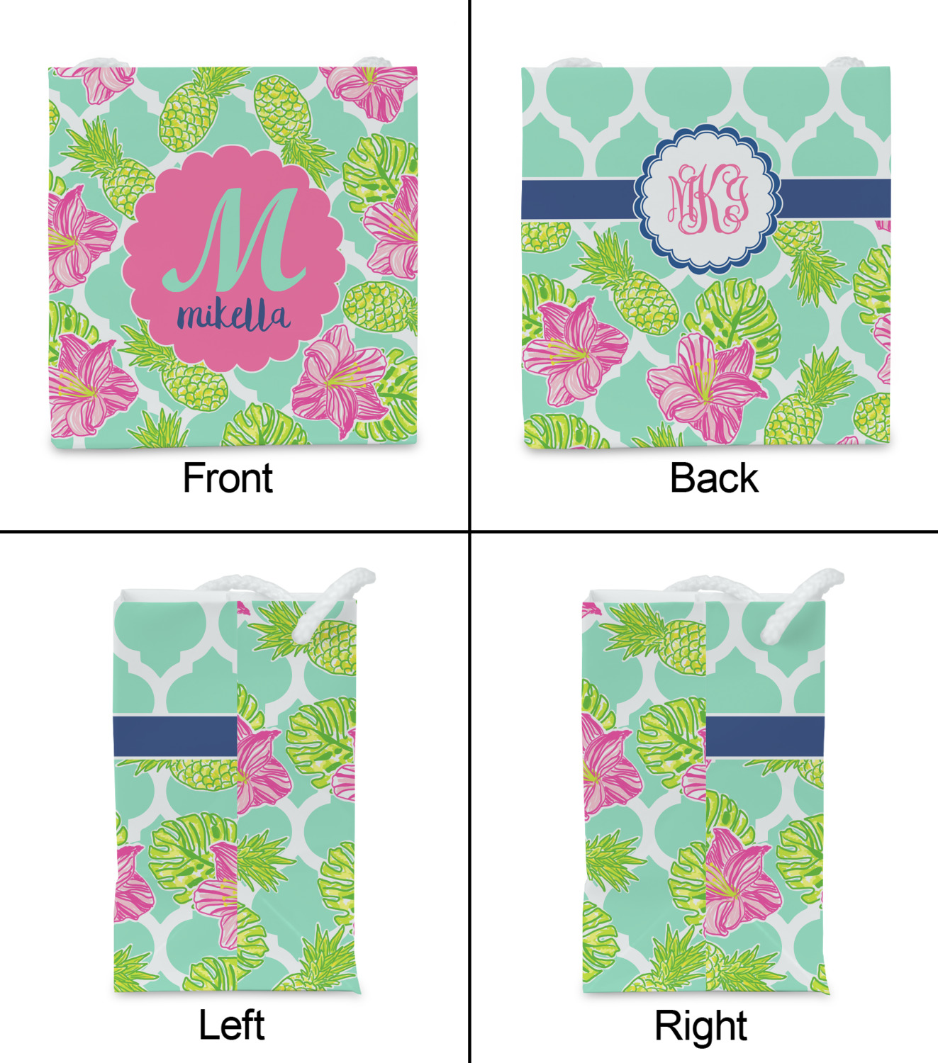 The background is a mint and white Moroccan lattice with brightly colored hibiscus flowers and pineapples. A scalloped frame sits in the center of the design with a fun name and initial personalization. With all of the fun bright yellows, greens, and pinks, you will just fawn over this design.