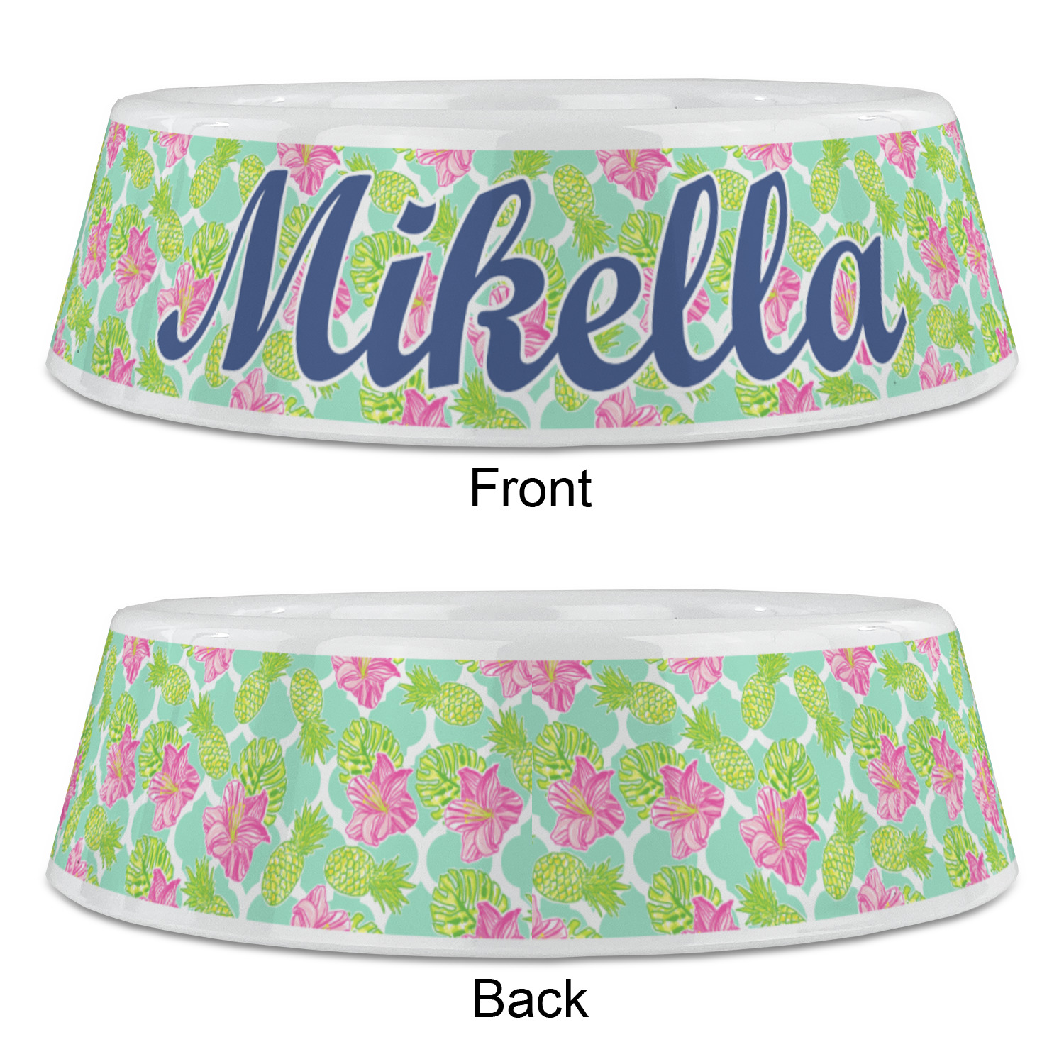 The background is a mint and white Moroccan lattice with brightly colored hibiscus flowers and pineapples. A scalloped frame sits in the center of the design with a fun name and initial personalization. With all of the fun bright yellows, greens, and pinks, you will just fawn over this design.