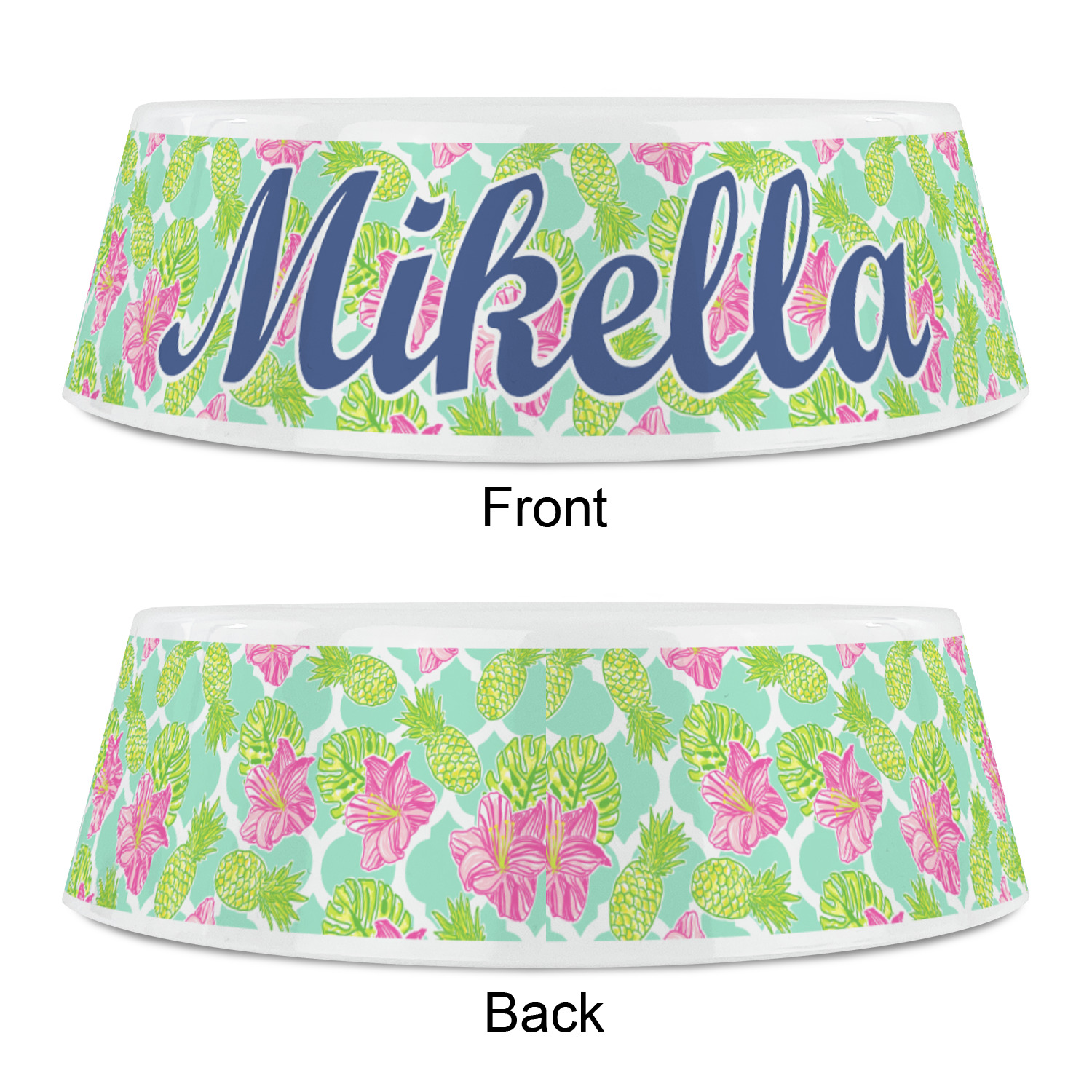 The background is a mint and white Moroccan lattice with brightly colored hibiscus flowers and pineapples. A scalloped frame sits in the center of the design with a fun name and initial personalization. With all of the fun bright yellows, greens, and pinks, you will just fawn over this design.