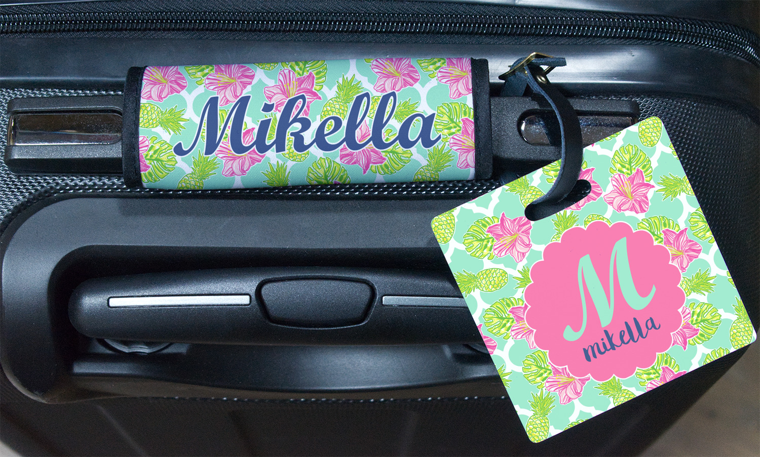 The background is a mint and white Moroccan lattice with brightly colored hibiscus flowers and pineapples. A scalloped frame sits in the center of the design with a fun name and initial personalization. With all of the fun bright yellows, greens, and pinks, you will just fawn over this design.