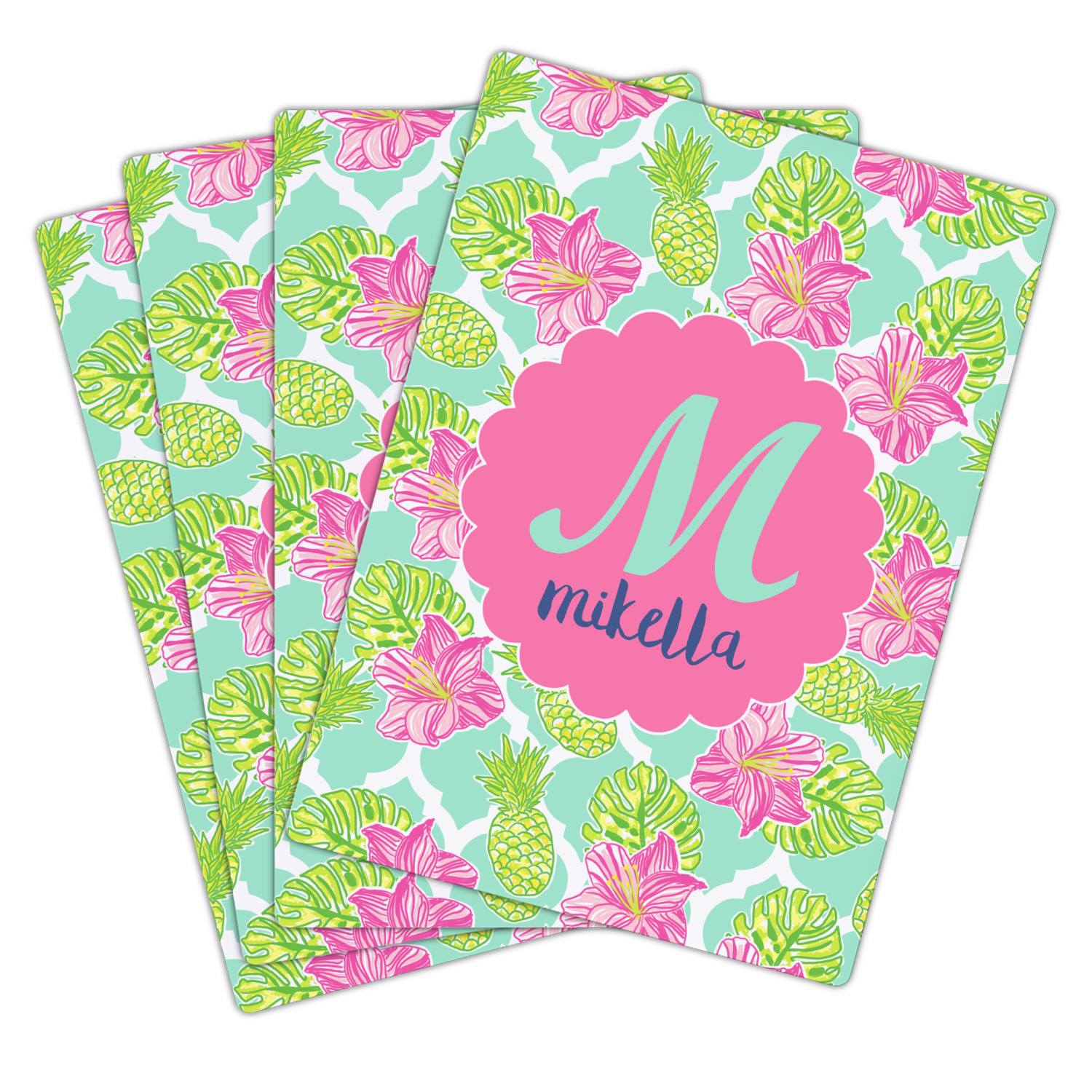 The background is a mint and white Moroccan lattice with brightly colored hibiscus flowers and pineapples. A scalloped frame sits in the center of the design with a fun name and initial personalization. With all of the fun bright yellows, greens, and pinks, you will just fawn over this design.