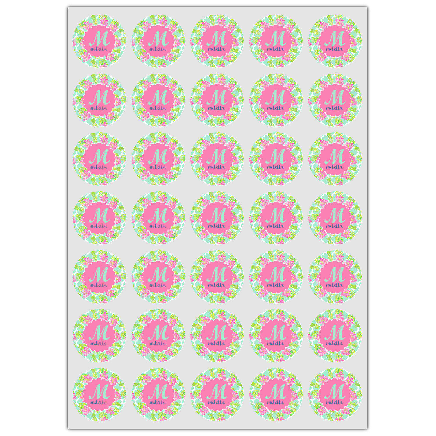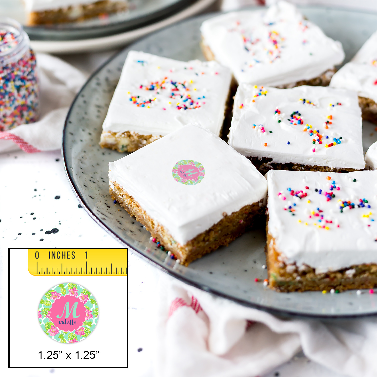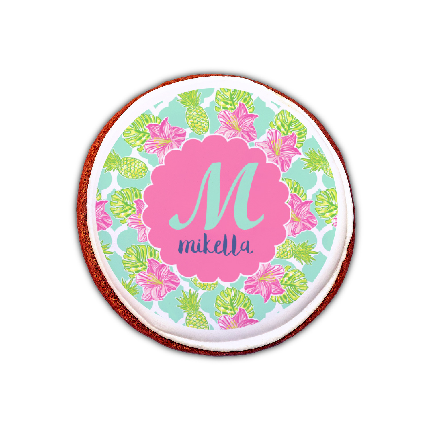 The background is a mint and white Moroccan lattice with brightly colored hibiscus flowers and pineapples. A scalloped frame sits in the center of the design with a fun name and initial personalization. With all of the fun bright yellows, greens, and pinks, you will just fawn over this design.