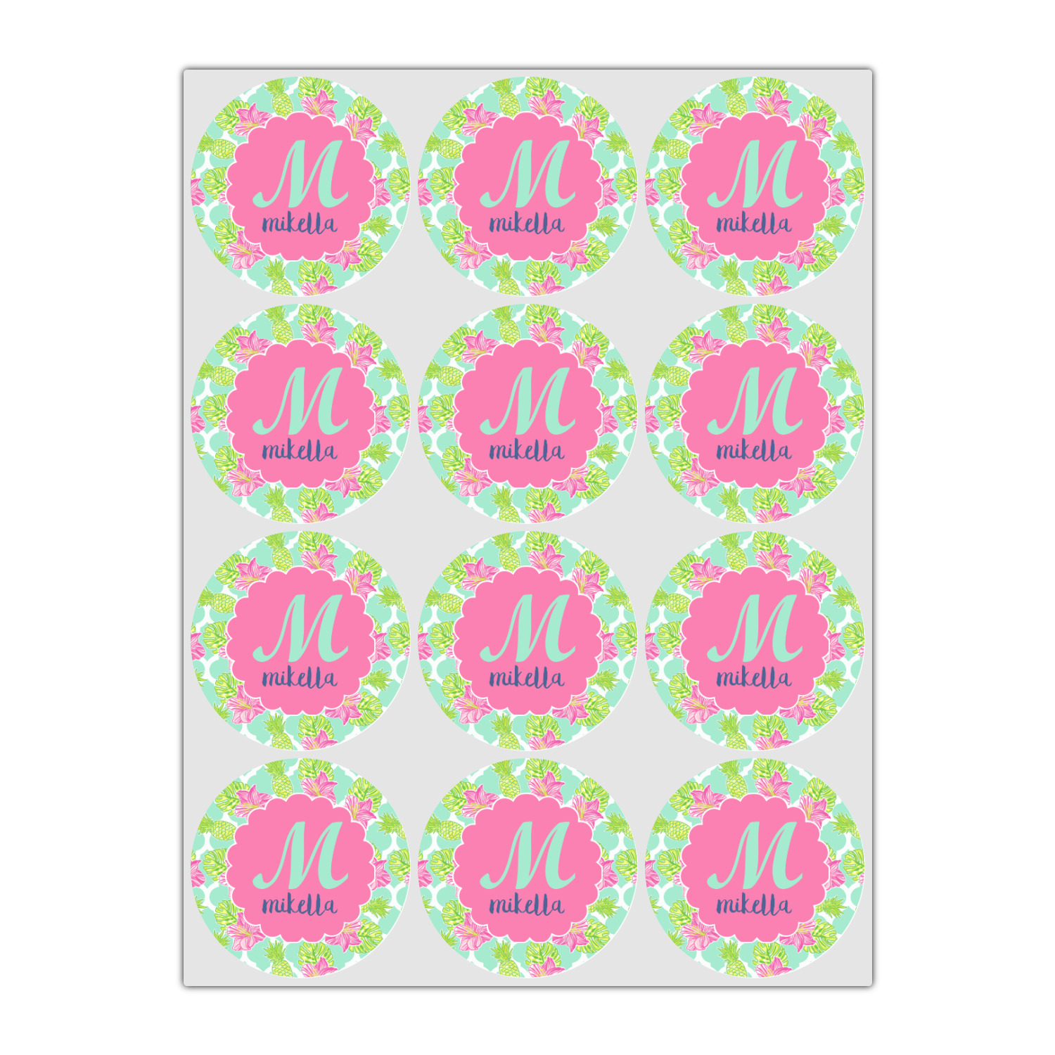 The background is a mint and white Moroccan lattice with brightly colored hibiscus flowers and pineapples. A scalloped frame sits in the center of the design with a fun name and initial personalization. With all of the fun bright yellows, greens, and pinks, you will just fawn over this design.
