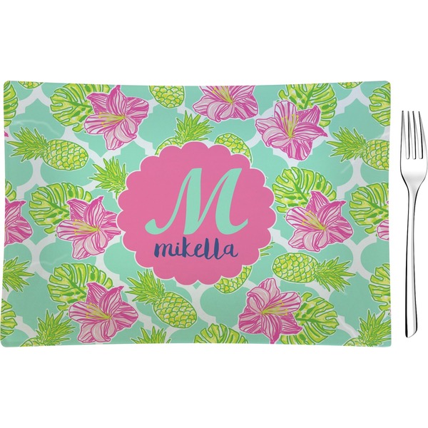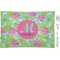 The background is a mint and white Moroccan lattice with brightly colored hibiscus flowers and pineapples. A scalloped frame sits in the center of the design with a fun name and initial personalization. With all of the fun bright yellows, greens, and pinks, you will just fawn over this design.