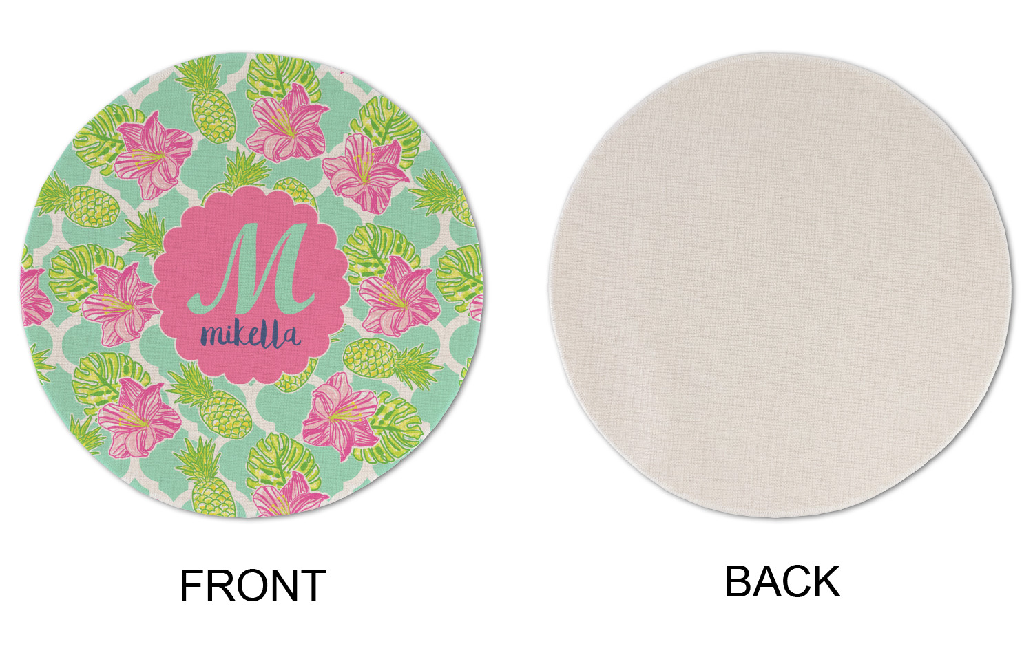 The background is a mint and white Moroccan lattice with brightly colored hibiscus flowers and pineapples. A scalloped frame sits in the center of the design with a fun name and initial personalization. With all of the fun bright yellows, greens, and pinks, you will just fawn over this design.
