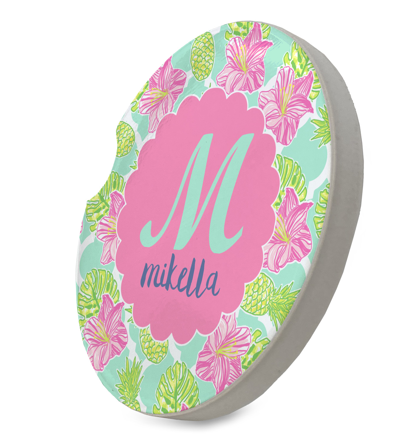The background is a mint and white Moroccan lattice with brightly colored hibiscus flowers and pineapples. A scalloped frame sits in the center of the design with a fun name and initial personalization. With all of the fun bright yellows, greens, and pinks, you will just fawn over this design.