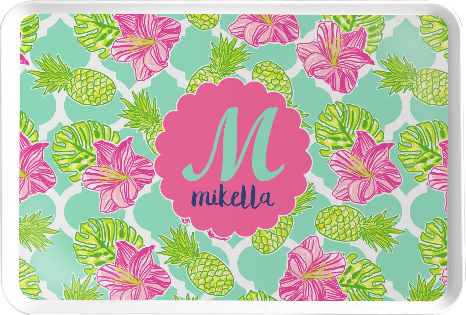 The background is a mint and white Moroccan lattice with brightly colored hibiscus flowers and pineapples. A scalloped frame sits in the center of the design with a fun name and initial personalization. With all of the fun bright yellows, greens, and pinks, you will just fawn over this design.