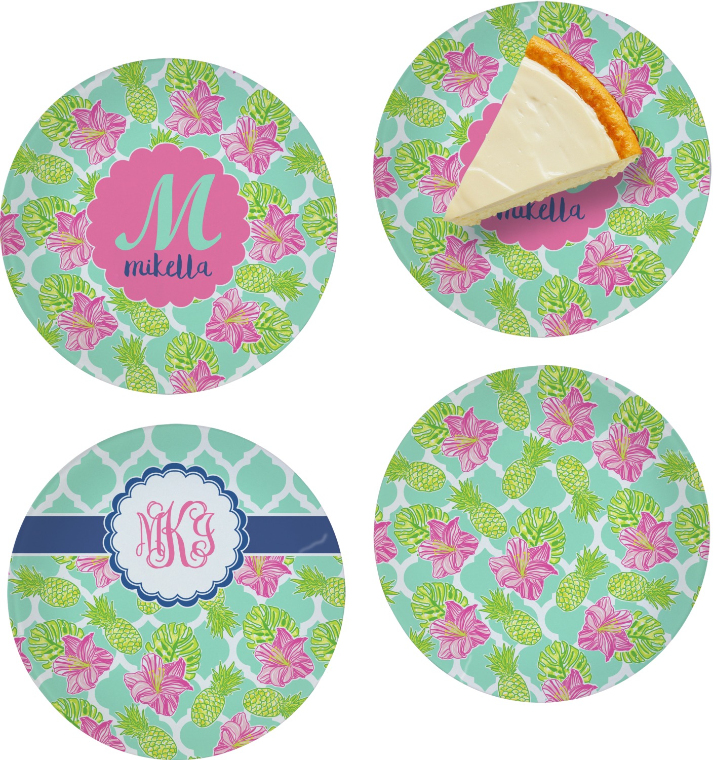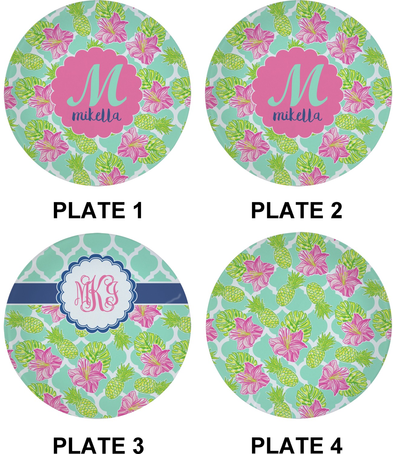 The background is a mint and white Moroccan lattice with brightly colored hibiscus flowers and pineapples. A scalloped frame sits in the center of the design with a fun name and initial personalization. With all of the fun bright yellows, greens, and pinks, you will just fawn over this design.