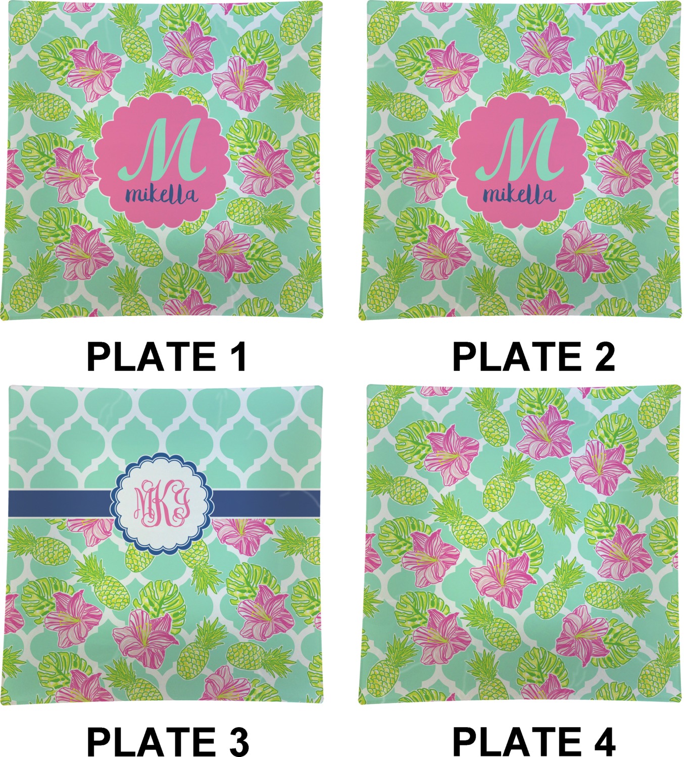 The background is a mint and white Moroccan lattice with brightly colored hibiscus flowers and pineapples. A scalloped frame sits in the center of the design with a fun name and initial personalization. With all of the fun bright yellows, greens, and pinks, you will just fawn over this design.