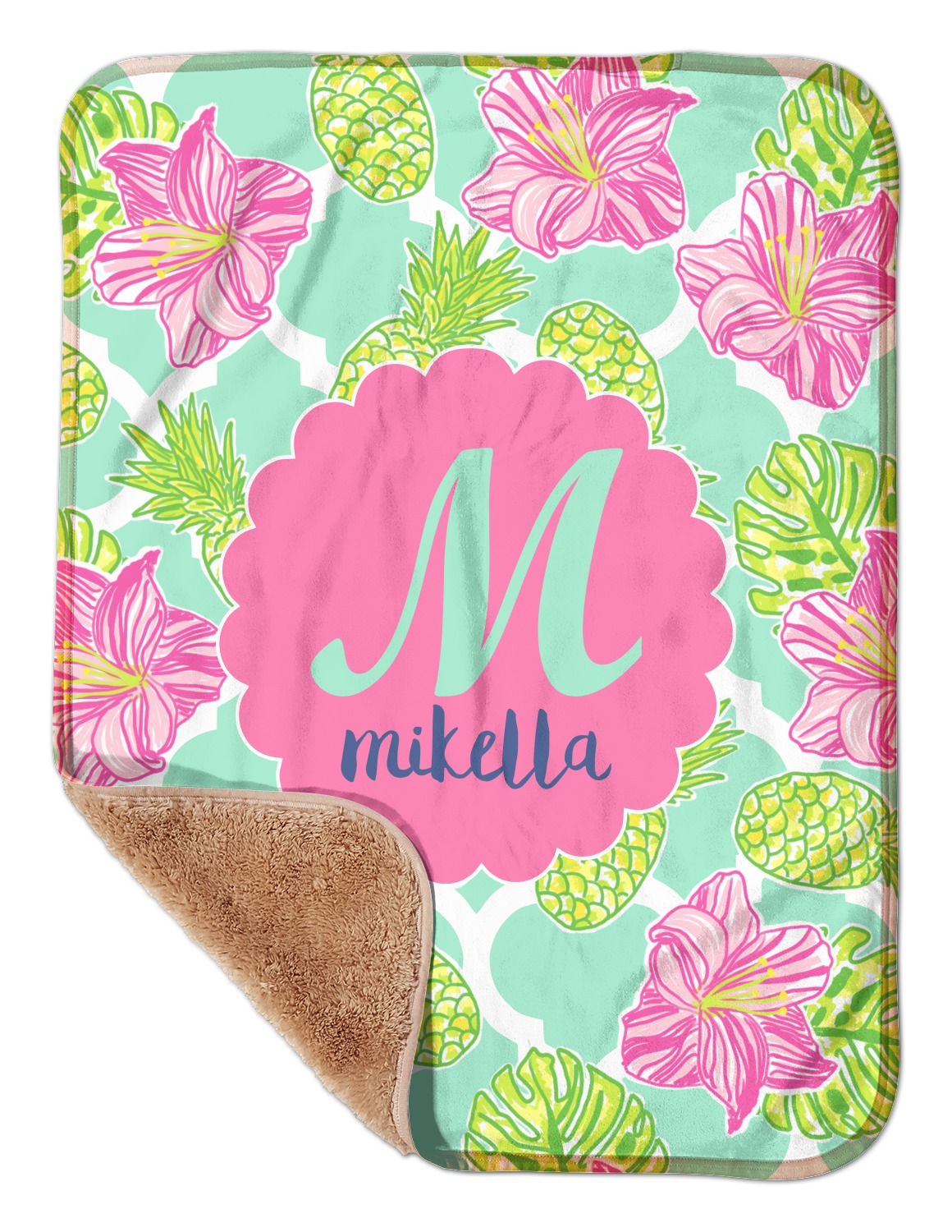 The background is a mint and white Moroccan lattice with brightly colored hibiscus flowers and pineapples. A scalloped frame sits in the center of the design with a fun name and initial personalization. With all of the fun bright yellows, greens, and pinks, you will just fawn over this design.