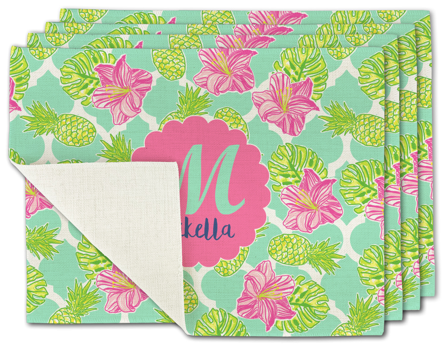 The background is a mint and white Moroccan lattice with brightly colored hibiscus flowers and pineapples. A scalloped frame sits in the center of the design with a fun name and initial personalization. With all of the fun bright yellows, greens, and pinks, you will just fawn over this design.