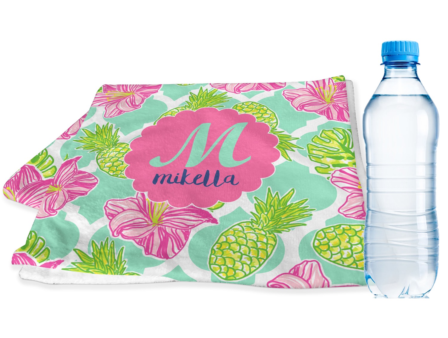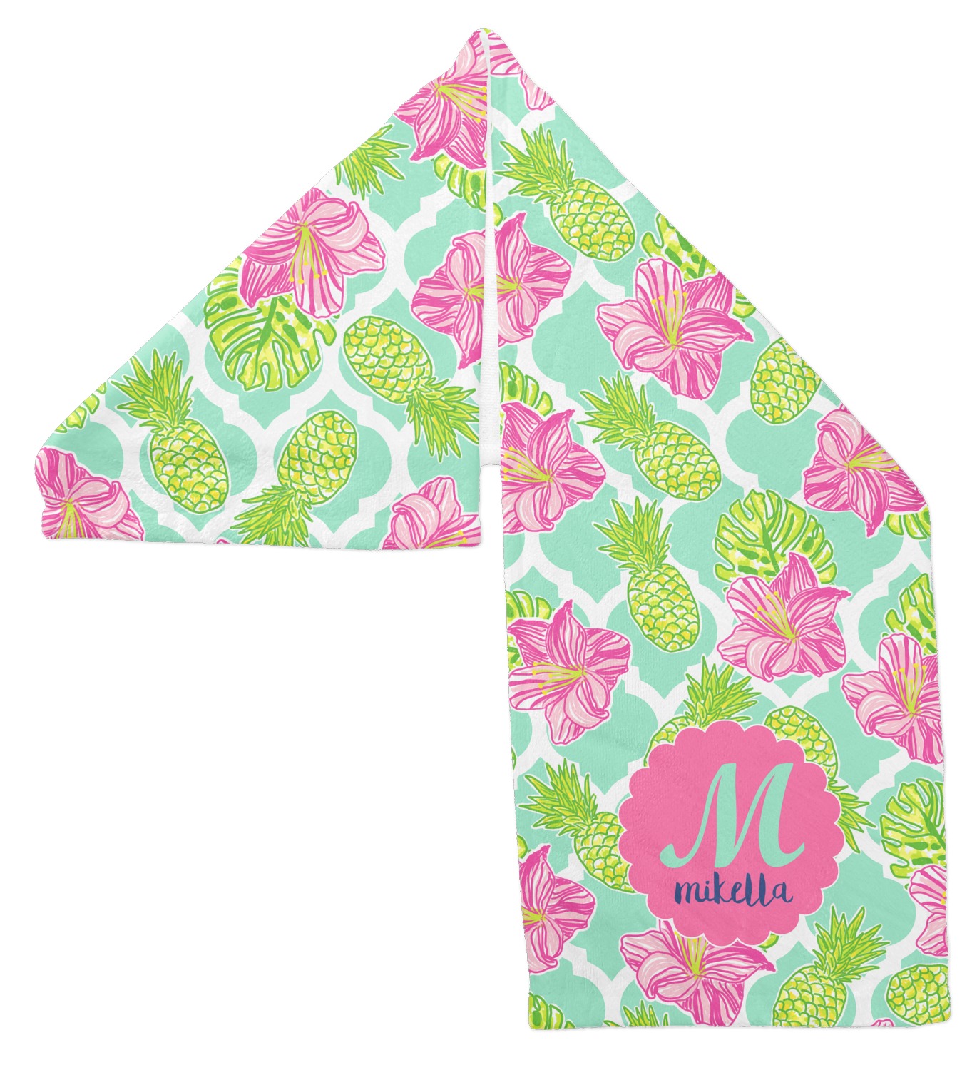 The background is a mint and white Moroccan lattice with brightly colored hibiscus flowers and pineapples. A scalloped frame sits in the center of the design with a fun name and initial personalization. With all of the fun bright yellows, greens, and pinks, you will just fawn over this design.