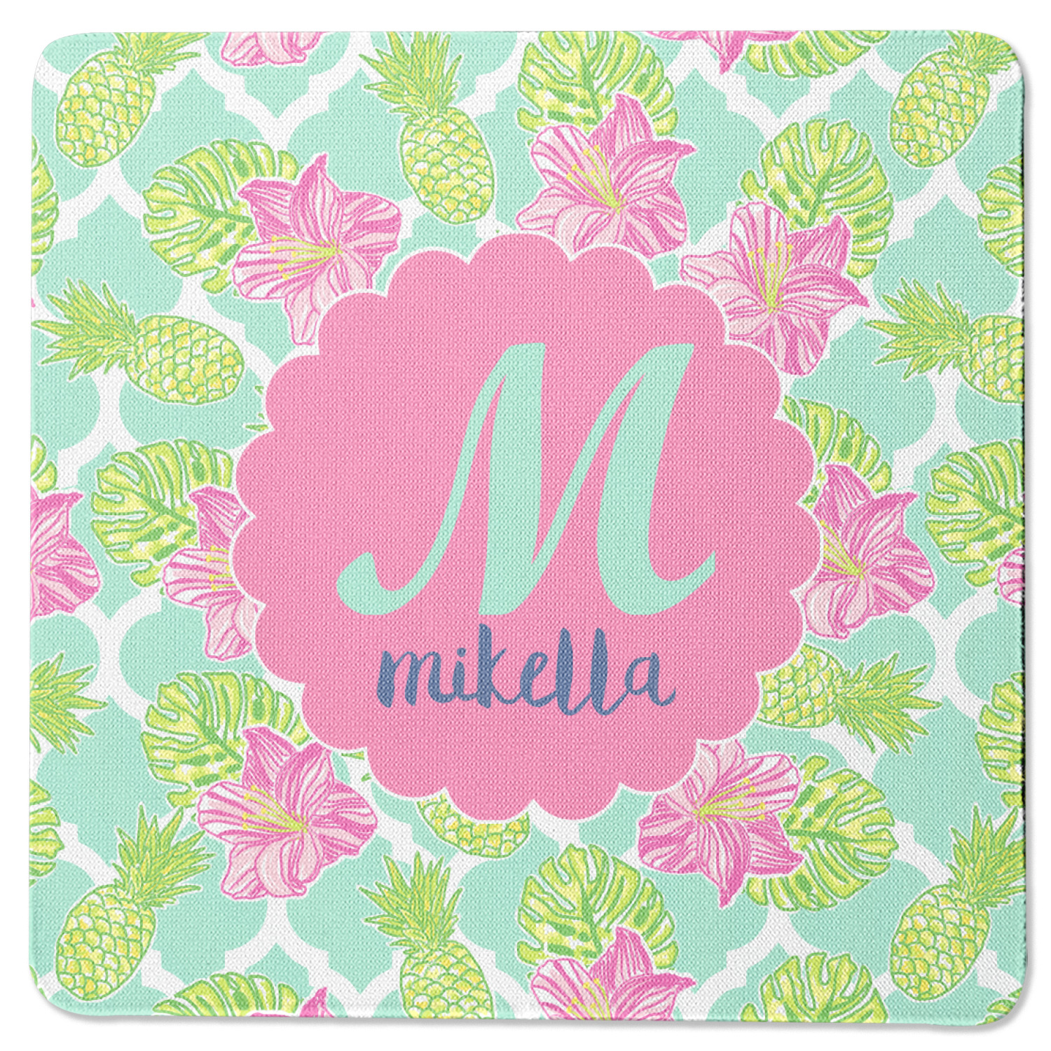 The background is a mint and white Moroccan lattice with brightly colored hibiscus flowers and pineapples. A scalloped frame sits in the center of the design with a fun name and initial personalization. With all of the fun bright yellows, greens, and pinks, you will just fawn over this design.