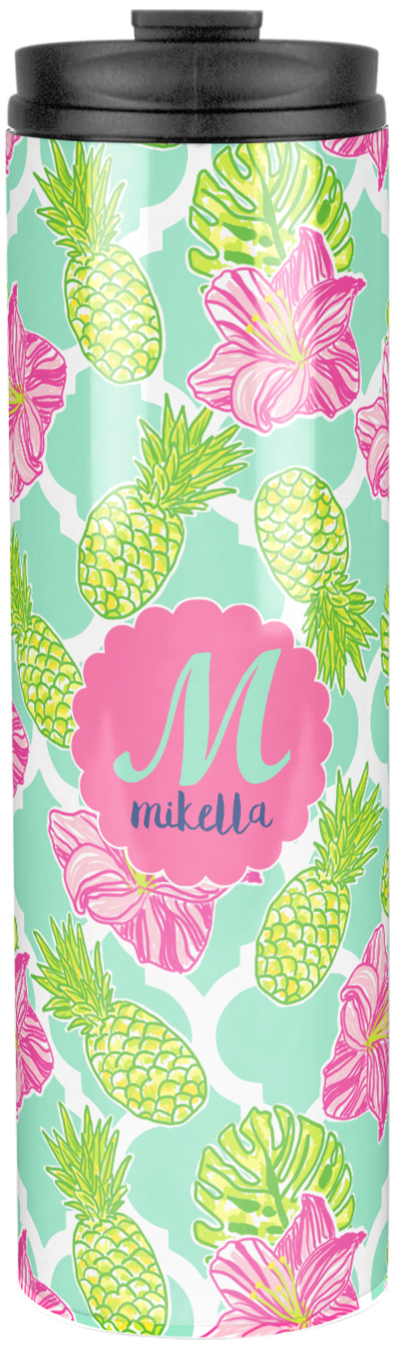 The background is a mint and white Moroccan lattice with brightly colored hibiscus flowers and pineapples. A scalloped frame sits in the center of the design with a fun name and initial personalization. With all of the fun bright yellows, greens, and pinks, you will just fawn over this design.