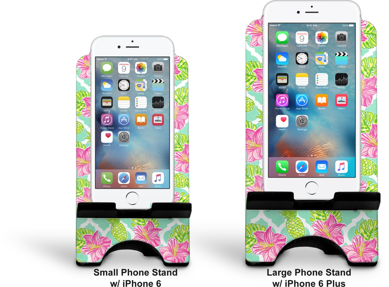 To meet your needs, we offer four variations of this IPhone stand. The backboard of the first version is shaped as a plain, yet sleek rectangle, and is available in two sizes. Our smaller size is approximately 4 by 3.25 by 7 inches, while the larger model is 4 by 3.77 by 8.5 inches. Alongside this model, we also provide you with a more decorative option. The upper part of our second version features a curved edge, for a classy, suave appearance. This phone holder is also sold in two sizes: a smaller version, which is 4 by 3.25 by 7 inches, and our larger model, which is 4 by 3.77 by 8.5 inches. Both models will support large phones, but the larger model is better if you wish to proudly display your personalized design.