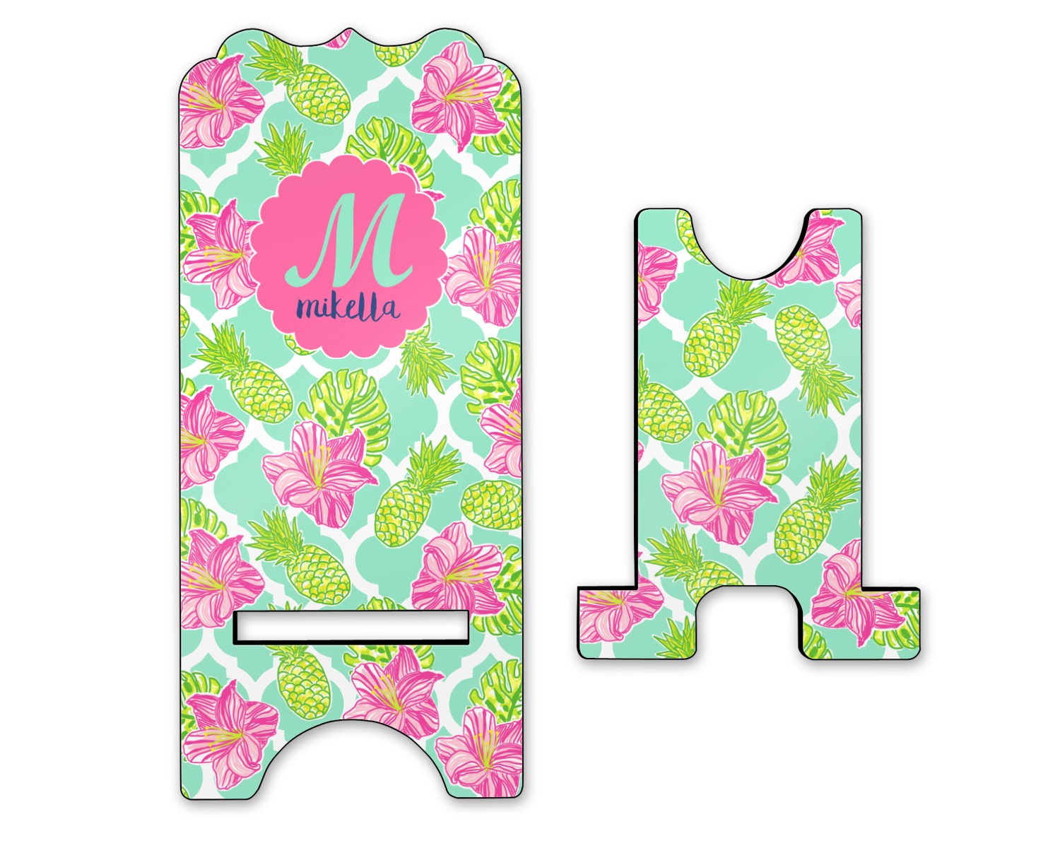 The background is a mint and white Moroccan lattice with brightly colored hibiscus flowers and pineapples. A scalloped frame sits in the center of the design with a fun name and initial personalization. With all of the fun bright yellows, greens, and pinks, you will just fawn over this design.