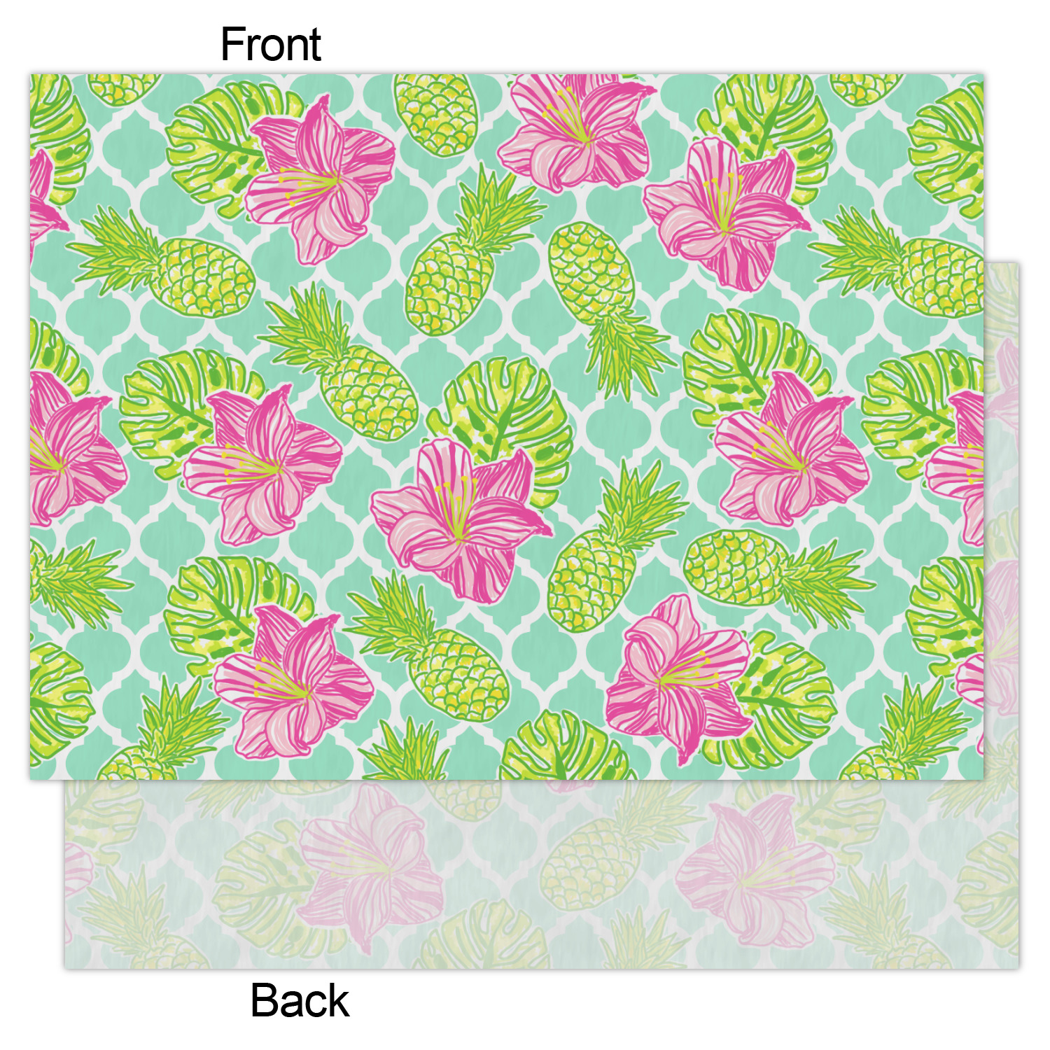 The background is a mint and white Moroccan lattice with brightly colored hibiscus flowers and pineapples. A scalloped frame sits in the center of the design with a fun name and initial personalization. With all of the fun bright yellows, greens, and pinks, you will just fawn over this design.