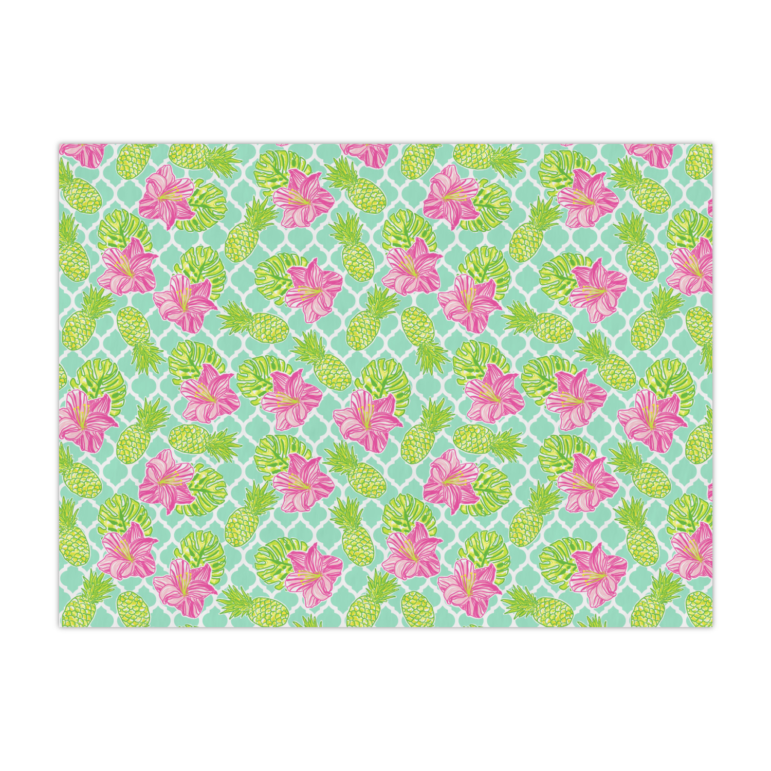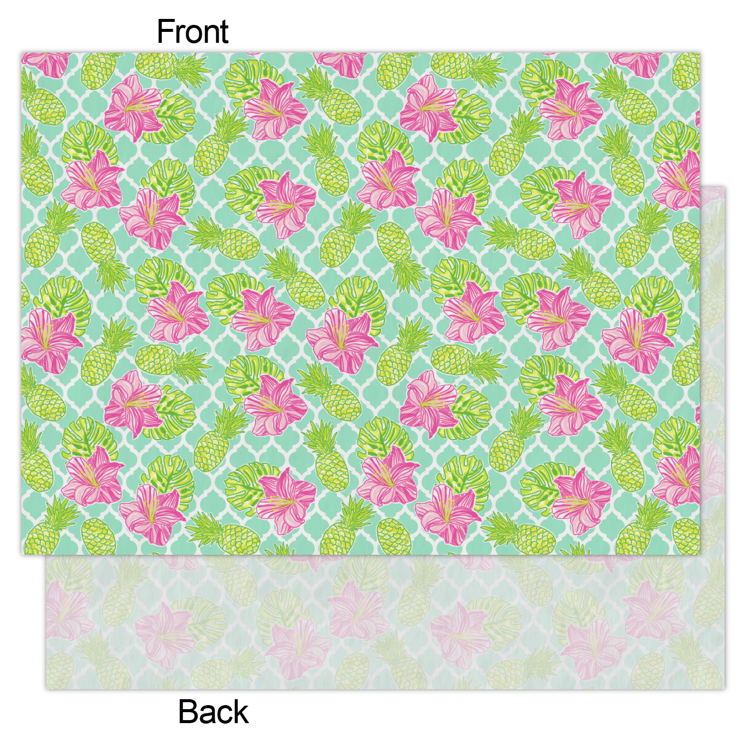 The background is a mint and white Moroccan lattice with brightly colored hibiscus flowers and pineapples. A scalloped frame sits in the center of the design with a fun name and initial personalization. With all of the fun bright yellows, greens, and pinks, you will just fawn over this design.
