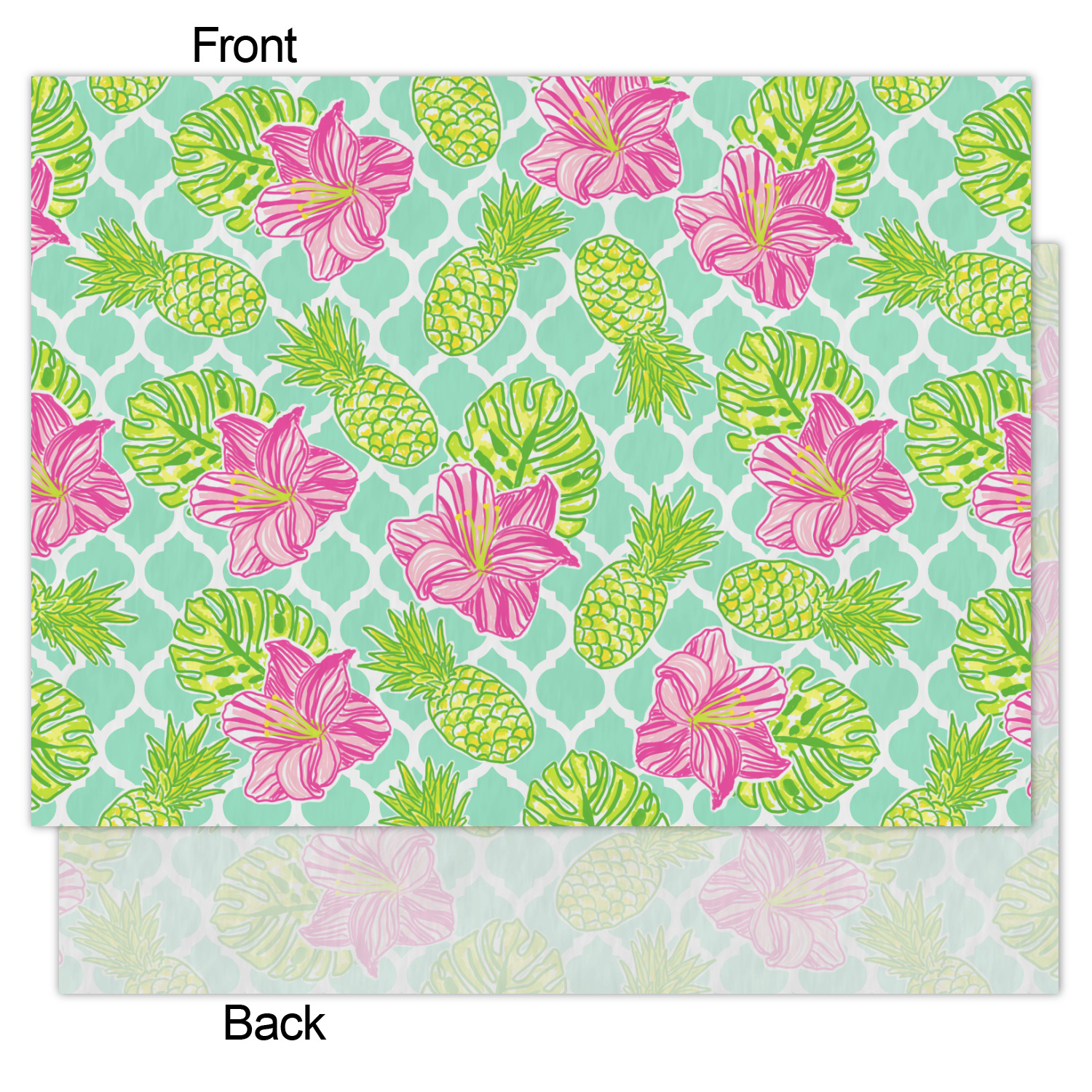 The background is a mint and white Moroccan lattice with brightly colored hibiscus flowers and pineapples. A scalloped frame sits in the center of the design with a fun name and initial personalization. With all of the fun bright yellows, greens, and pinks, you will just fawn over this design.