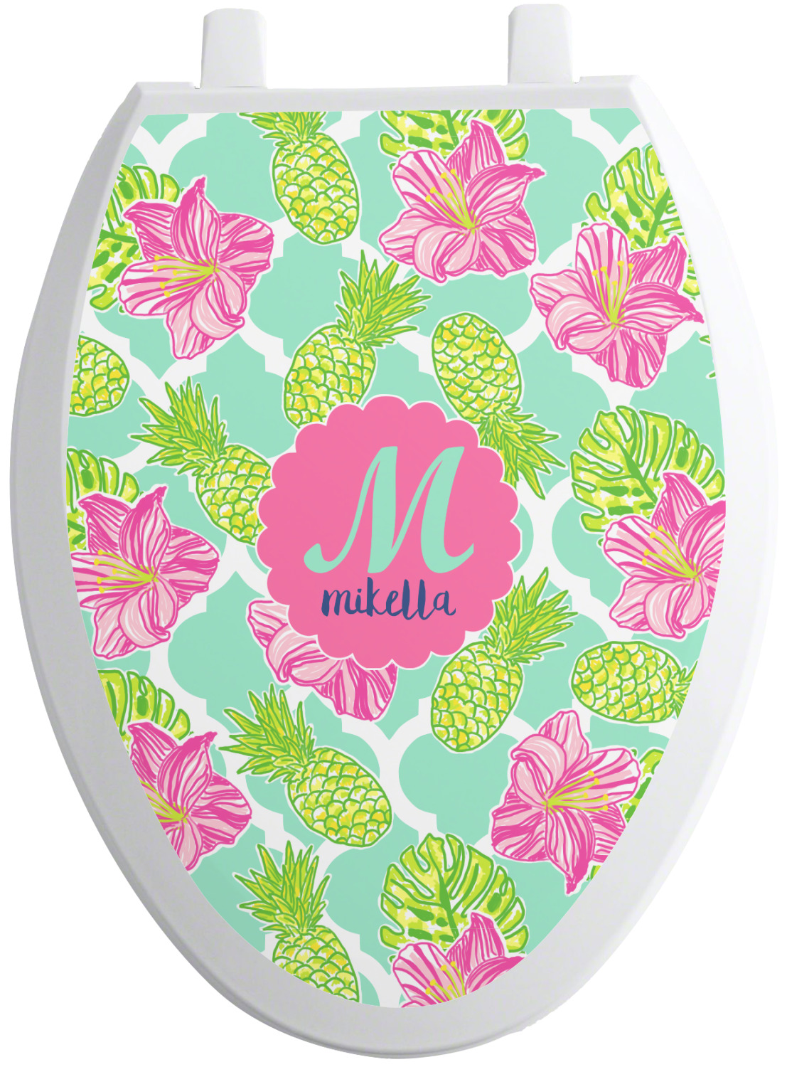 The background is a mint and white Moroccan lattice with brightly colored hibiscus flowers and pineapples. A scalloped frame sits in the center of the design with a fun name and initial personalization. With all of the fun bright yellows, greens, and pinks, you will just fawn over this design.