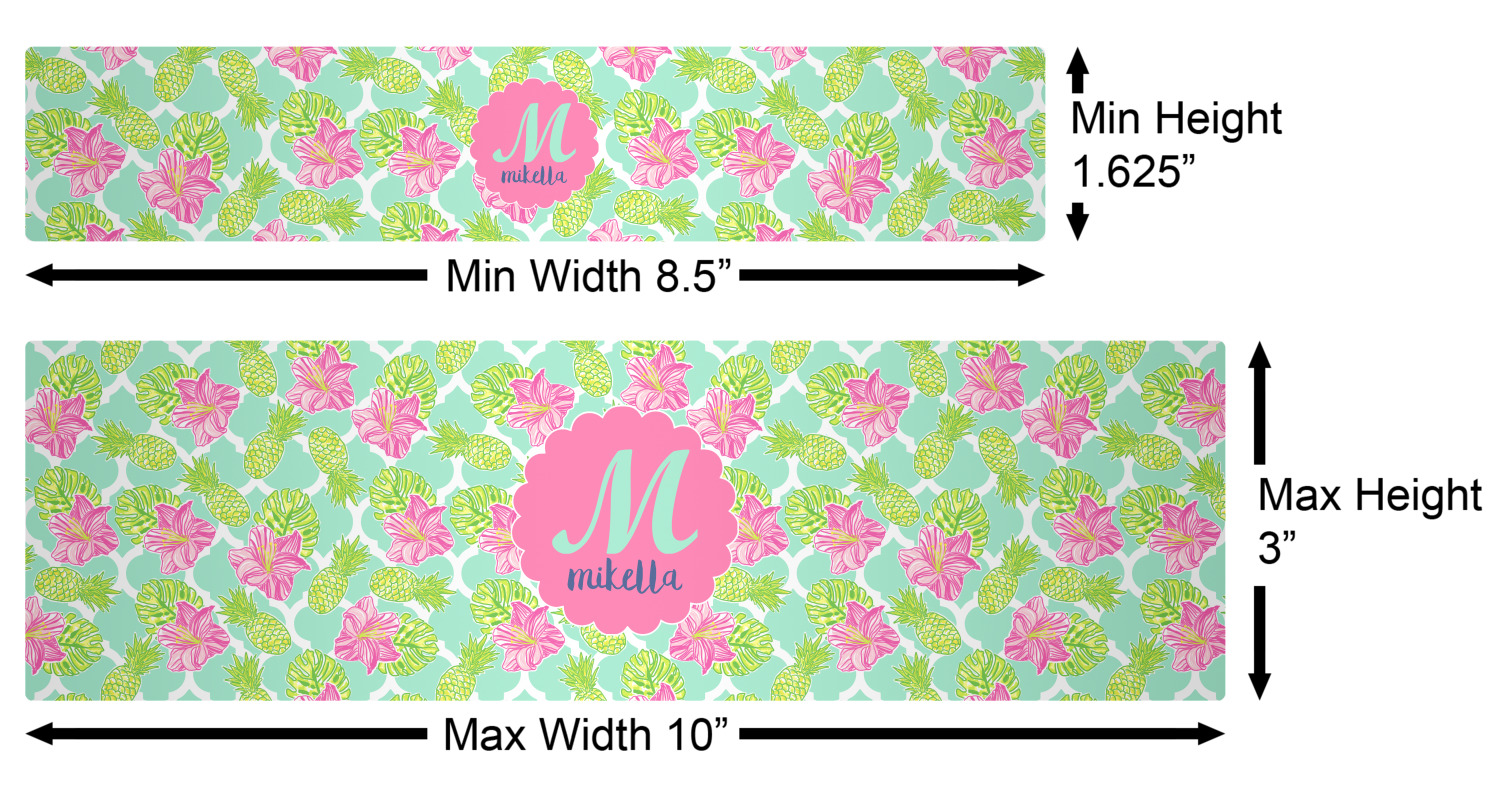 The background is a mint and white Moroccan lattice with brightly colored hibiscus flowers and pineapples. A scalloped frame sits in the center of the design with a fun name and initial personalization. With all of the fun bright yellows, greens, and pinks, you will just fawn over this design.