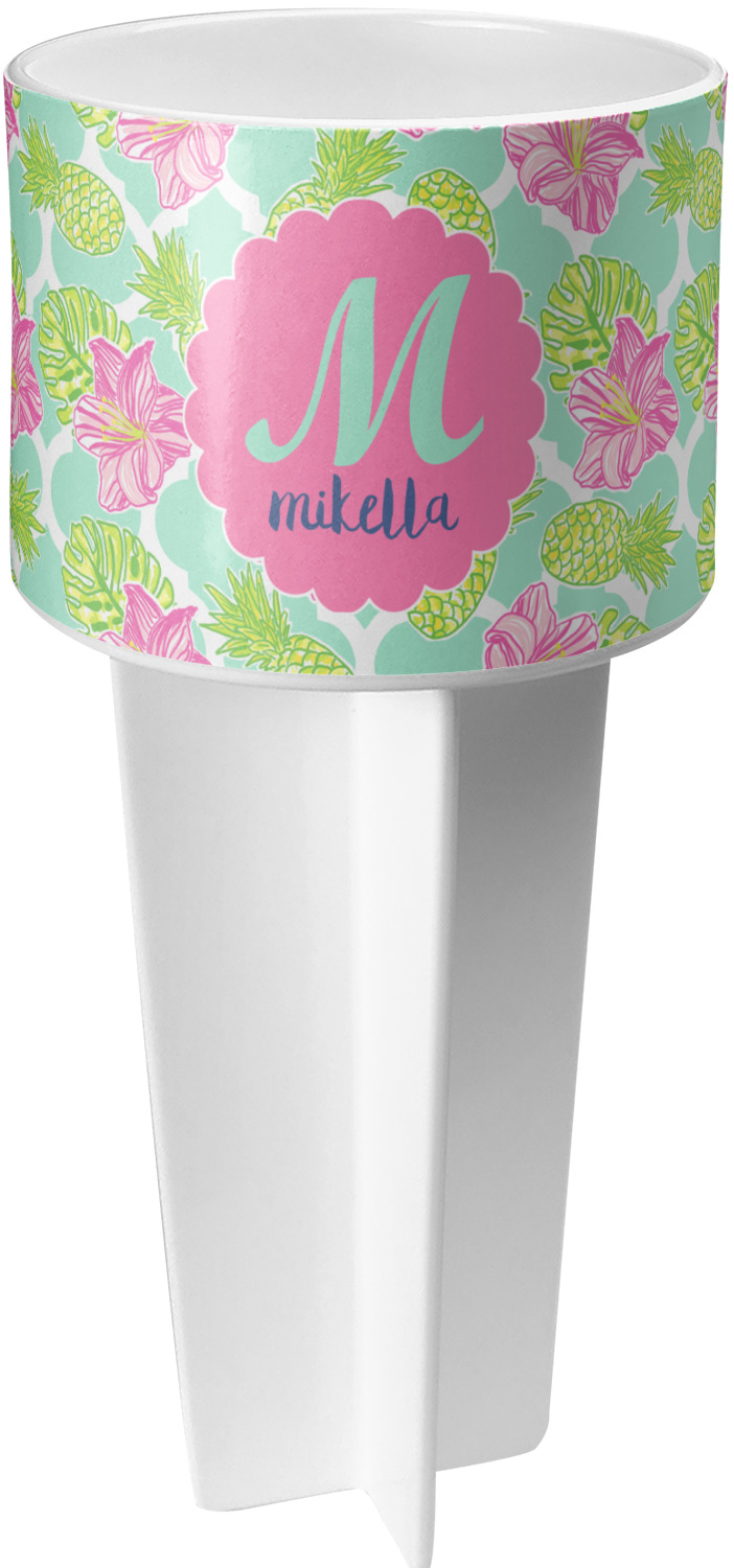 This cup holder has a large stake at its bottom that anchors it to the sand or ground below, while the cup holder rests above the stake. The entire drink holder is made of durable plastic and displays your customization around the cup holder portion. We sell these personalized beach spikers in two different colors: black and white.
