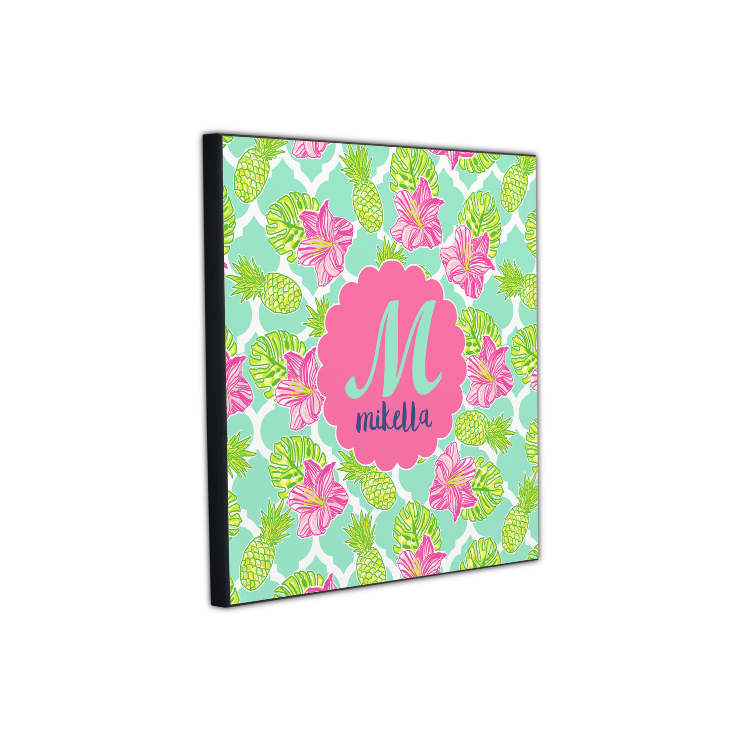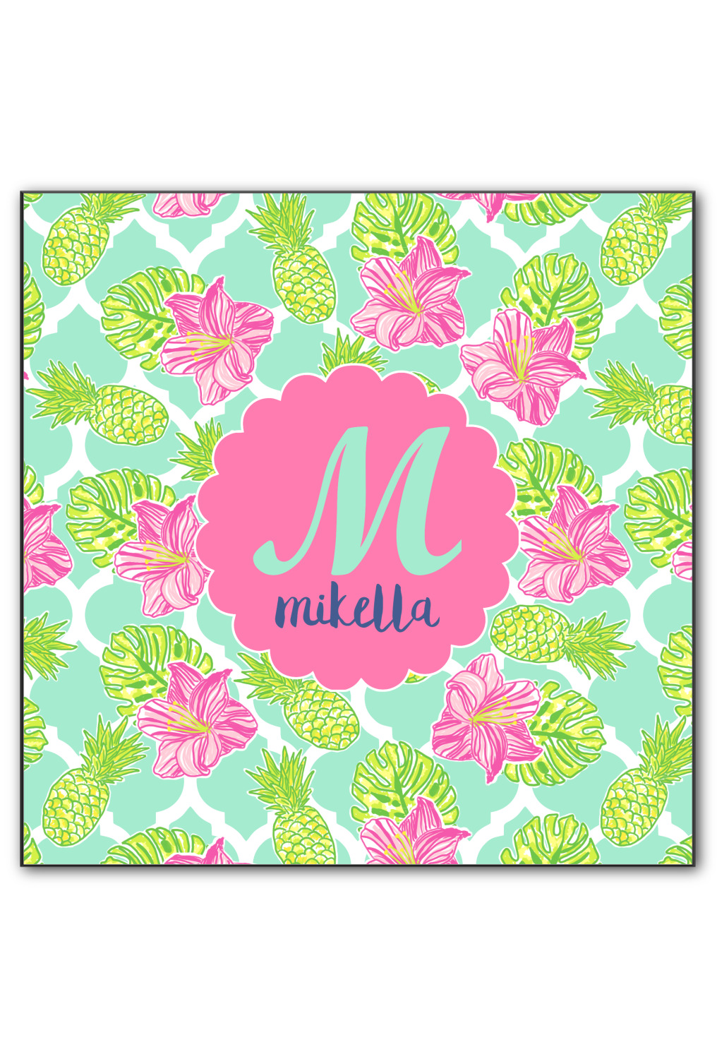 The background is a mint and white Moroccan lattice with brightly colored hibiscus flowers and pineapples. A scalloped frame sits in the center of the design with a fun name and initial personalization. With all of the fun bright yellows, greens, and pinks, you will just fawn over this design.