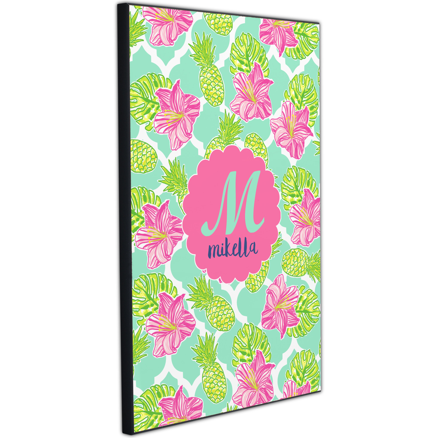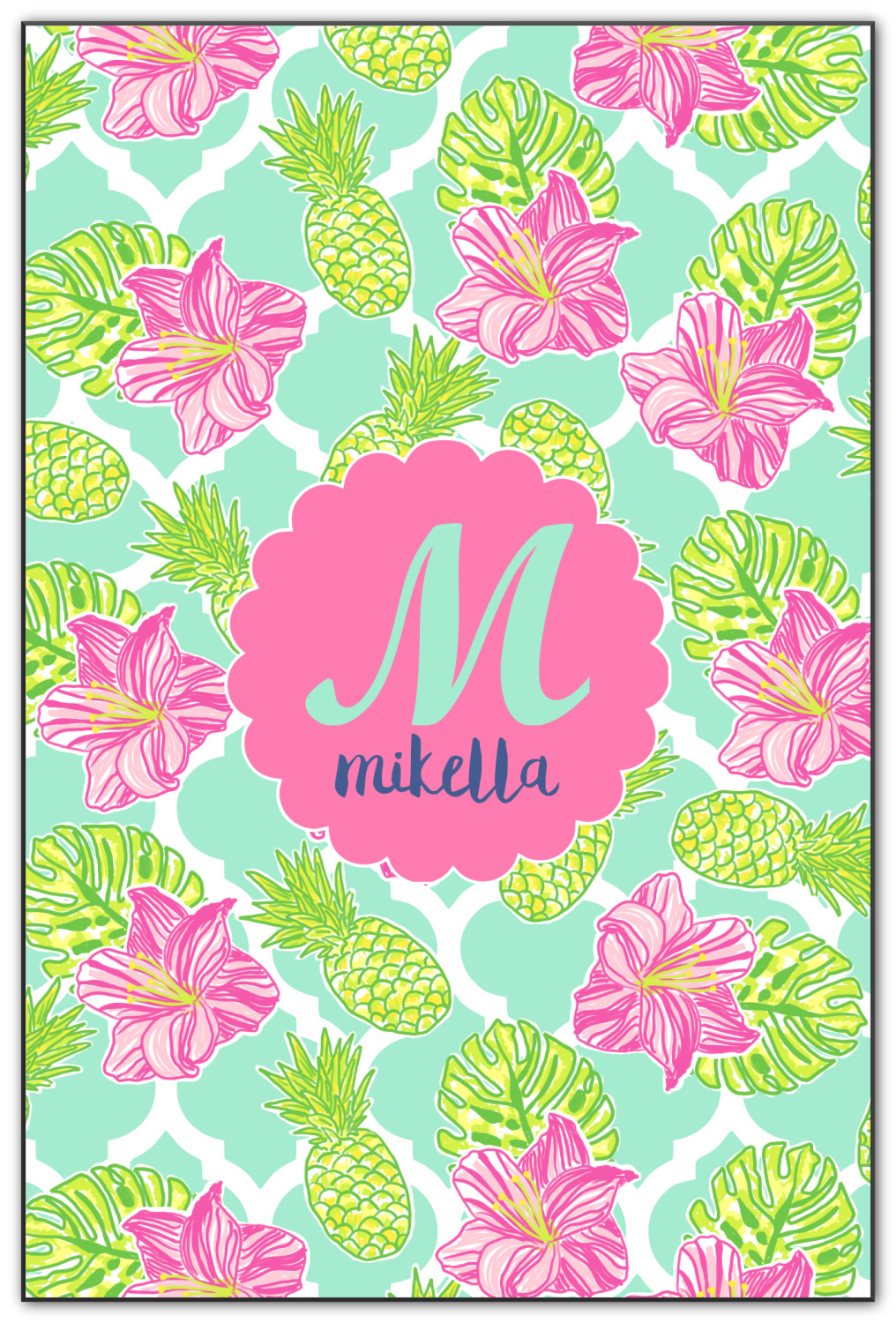 The background is a mint and white Moroccan lattice with brightly colored hibiscus flowers and pineapples. A scalloped frame sits in the center of the design with a fun name and initial personalization. With all of the fun bright yellows, greens, and pinks, you will just fawn over this design.