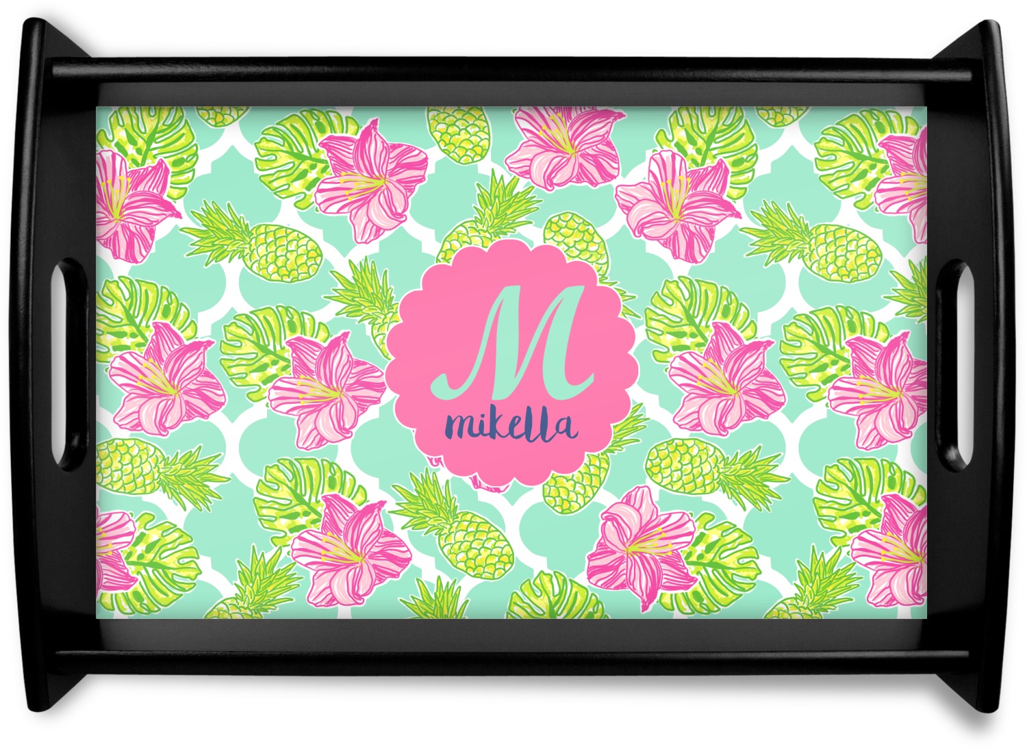 The background is a mint and white Moroccan lattice with brightly colored hibiscus flowers and pineapples. A scalloped frame sits in the center of the design with a fun name and initial personalization. With all of the fun bright yellows, greens, and pinks, you will just fawn over this design.