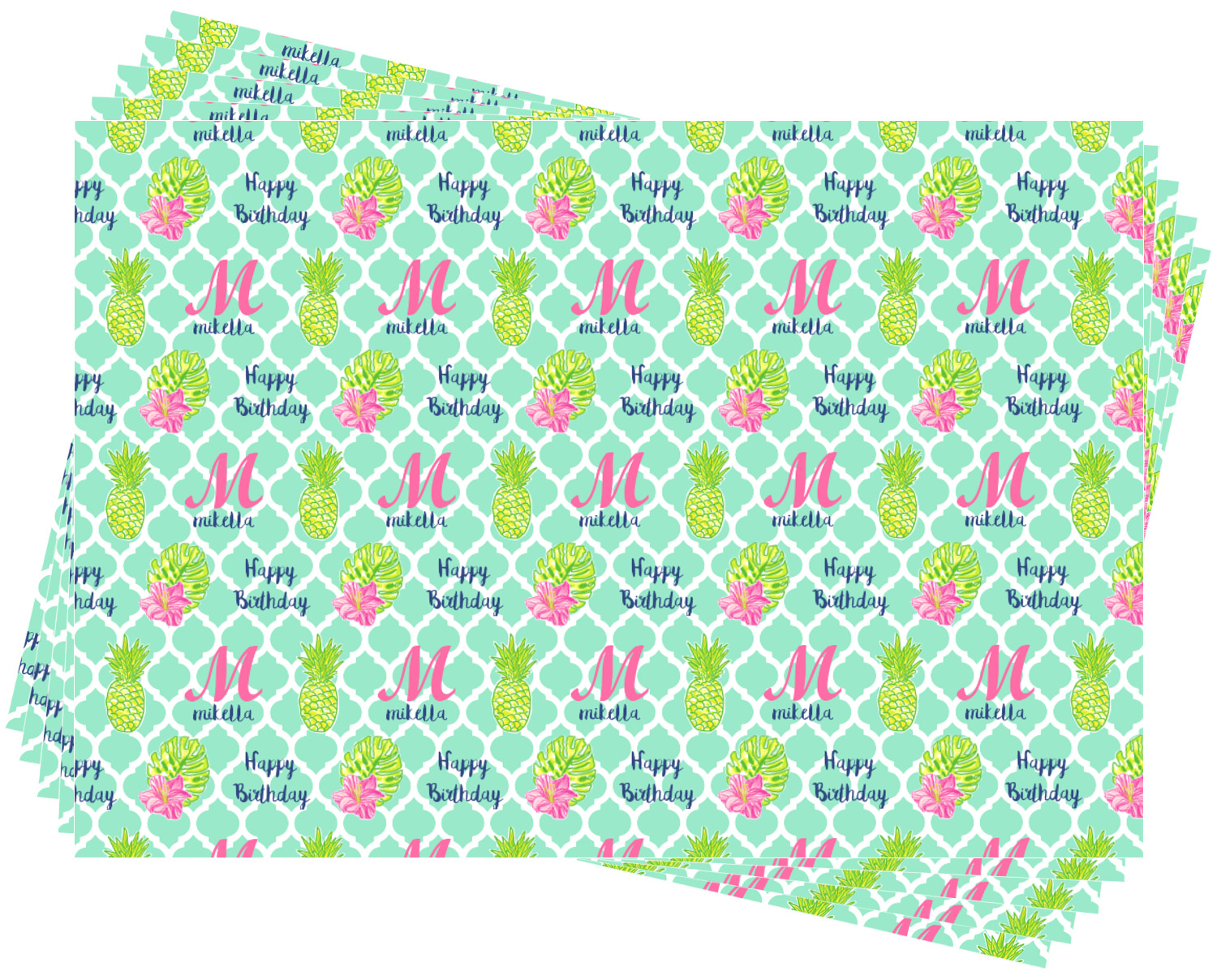 The background is a mint and white Moroccan lattice with brightly colored hibiscus flowers and pineapples. A scalloped frame sits in the center of the design with a fun name and initial personalization. With all of the fun bright yellows, greens, and pinks, you will just fawn over this design.