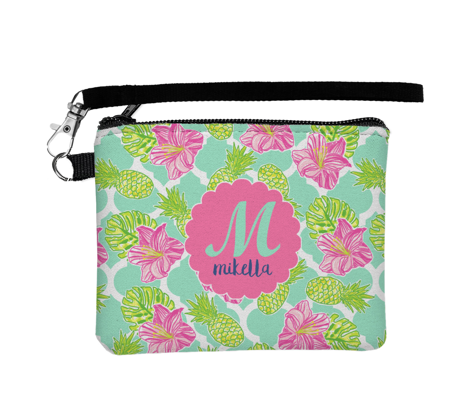 The background is a mint and white Moroccan lattice with brightly colored hibiscus flowers and pineapples. A scalloped frame sits in the center of the design with a fun name and initial personalization. With all of the fun bright yellows, greens, and pinks, you will just fawn over this design.