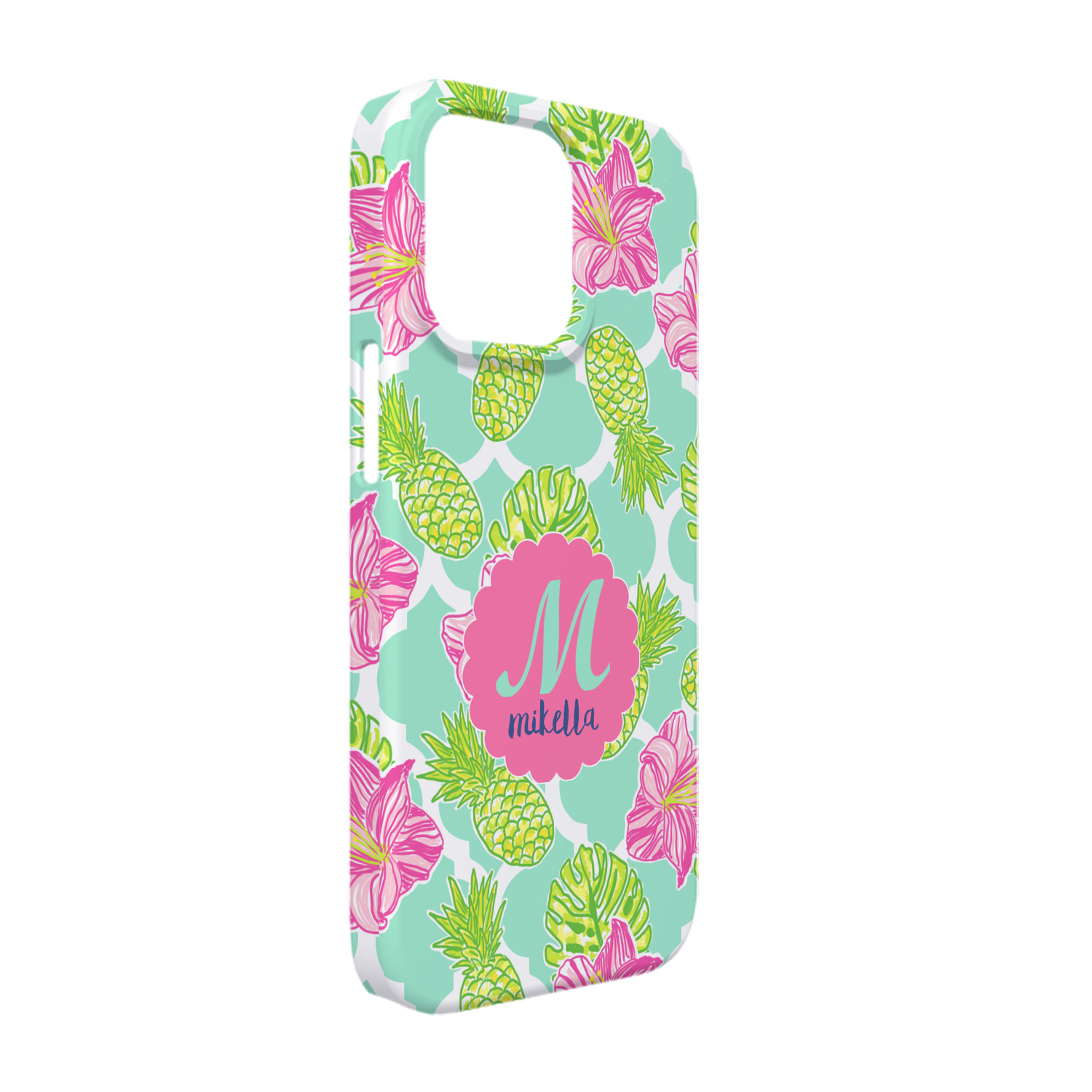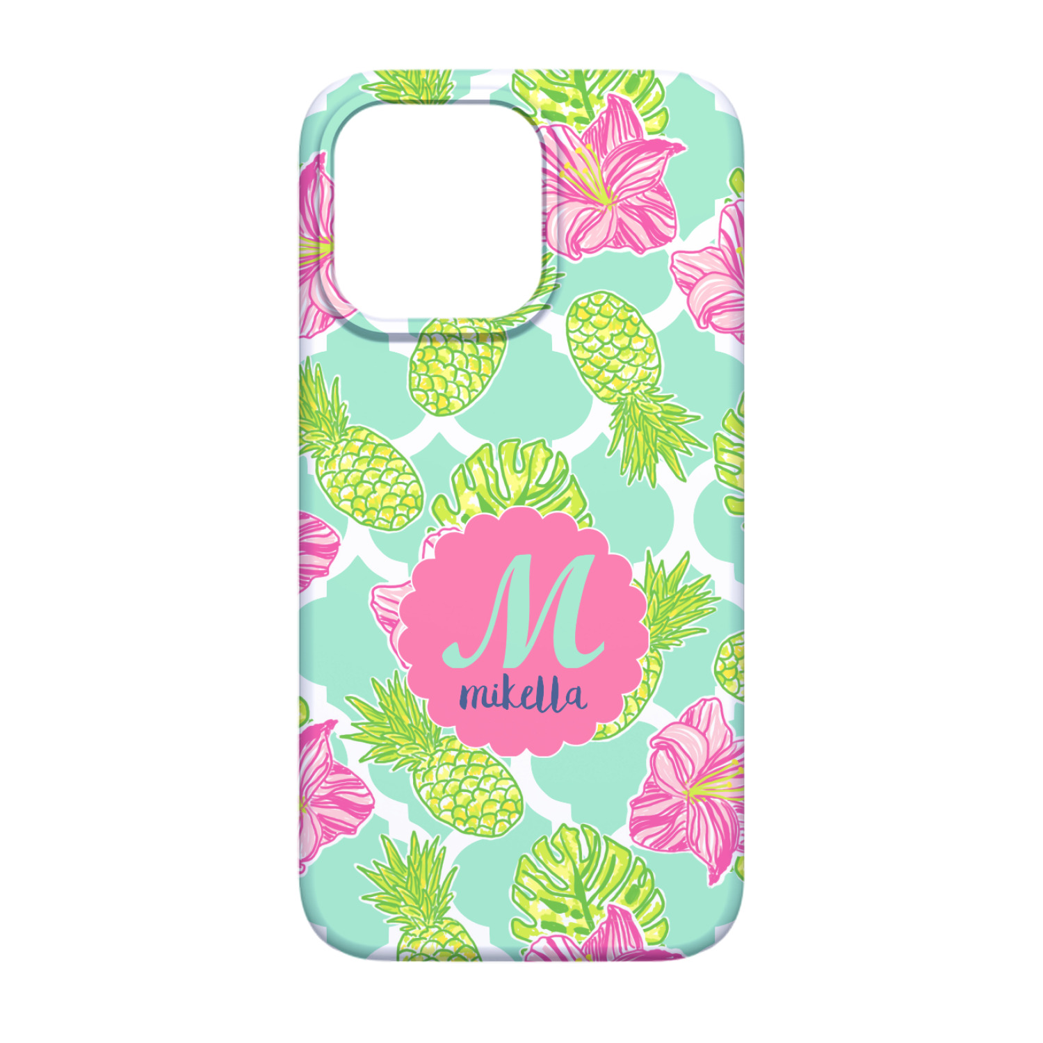 The background is a mint and white Moroccan lattice with brightly colored hibiscus flowers and pineapples. A scalloped frame sits in the center of the design with a fun name and initial personalization. With all of the fun bright yellows, greens, and pinks, you will just fawn over this design.