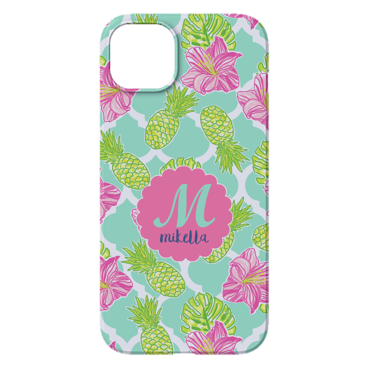 The background is a mint and white Moroccan lattice with brightly colored hibiscus flowers and pineapples. A scalloped frame sits in the center of the design with a fun name and initial personalization. With all of the fun bright yellows, greens, and pinks, you will just fawn over this design.